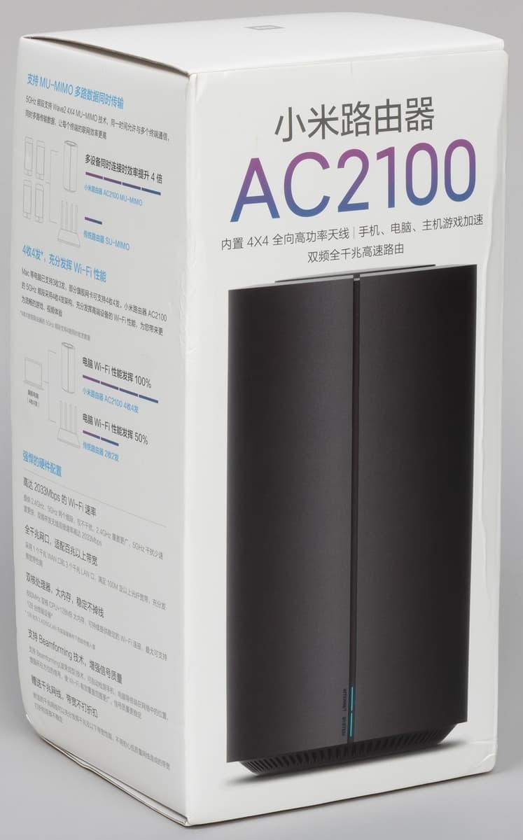Роутер поставляется в обычной картонной коробке. Судя по нашему экземпляру, она способна защитить устройство только от некоторых опасностей транспортировки. Оформление — исключительно на китайском языке. Из ключевых характеристик производитель отмечает гигабитные проводные порты, покрытие беспроводной сети в 200 м2, возможность обслуживания 128 устройств.