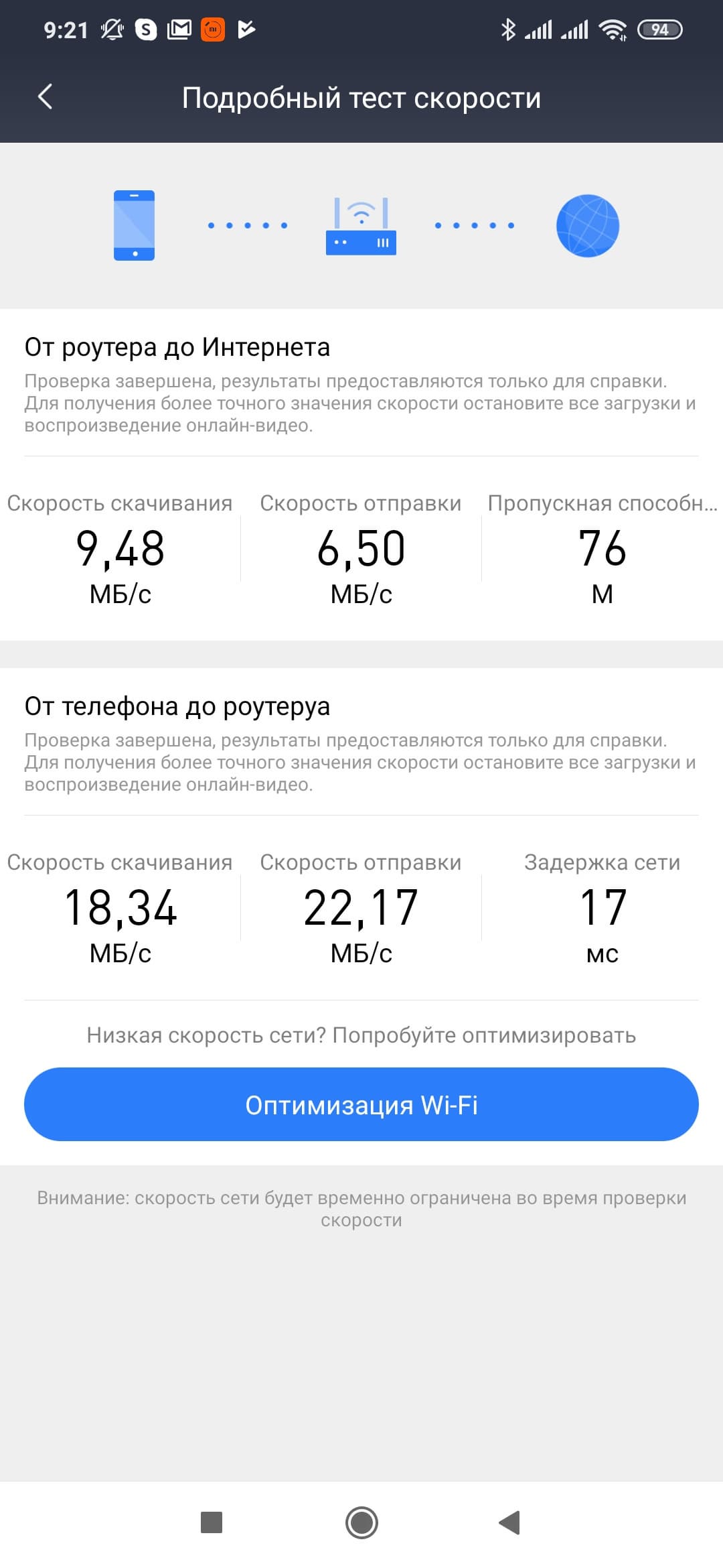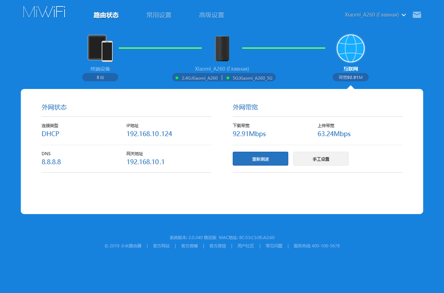 Если же щелкнуть на глобусе — будет показана страница статуса подключения к интернету. Кроме адресов, на ней представлены и результаты встроенного теста скорости канала.