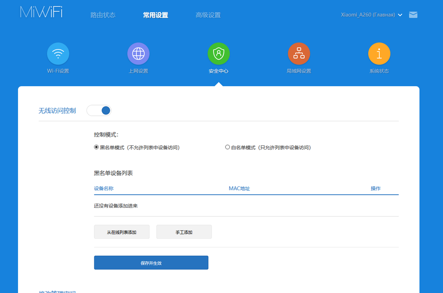 Страница с зеленым значком позволяет создать списки доступа Wi-Fi (белый или черный) для клиентов, а также поменять пароль для управления роутером (при первой настройке через помощника он совпадает с паролем беспроводной сети).