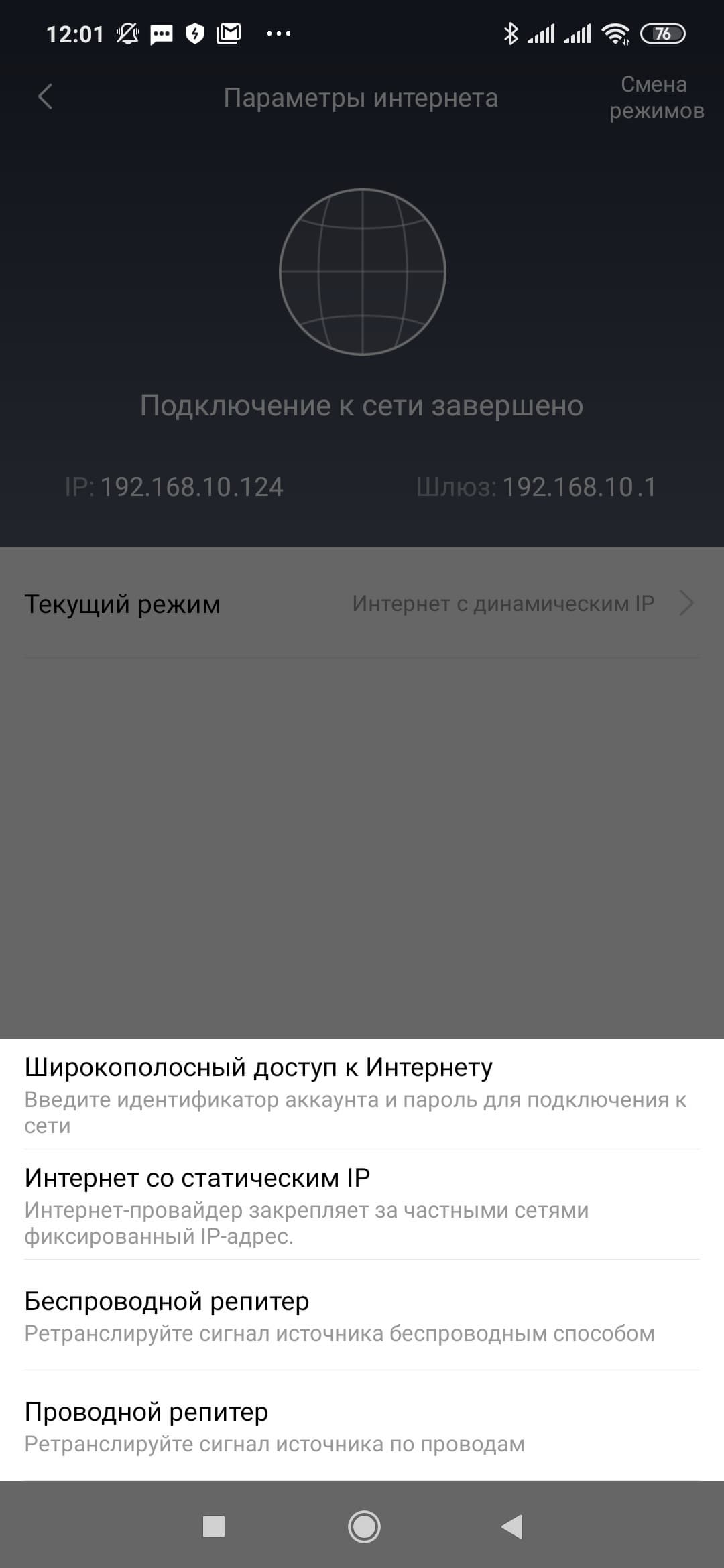 Роутер поддерживает подключение к провайдеру по технологиям IPoE и PPPoE. В первом случае можно настроить автоматическое получение адреса или назначить его в ручном режиме. Есть опция по замене MAC-адреса порта WAN, выбор скорости этого порта, поддержка IPv6. На этой же странице можно переключить устройство из режима роутера в режим повторителя для расширения зоны покрытия беспроводной сети совместно с другим основным роутером.