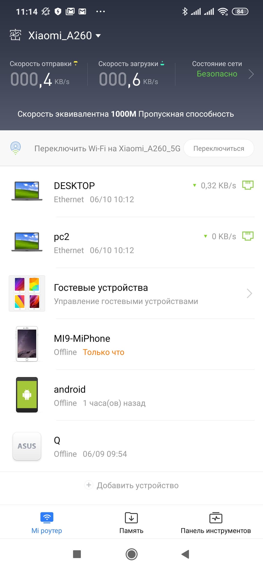 Пару слов стоит сказать про интеграцию роутера в приложение Mi Home после привязки к аккаунту Mi. При выборе соответствующего значка на главном экране программы вы попадаете в сильно упрощенную версию описанной выше Mi WiFi на английском языке с вкраплениями китайского.