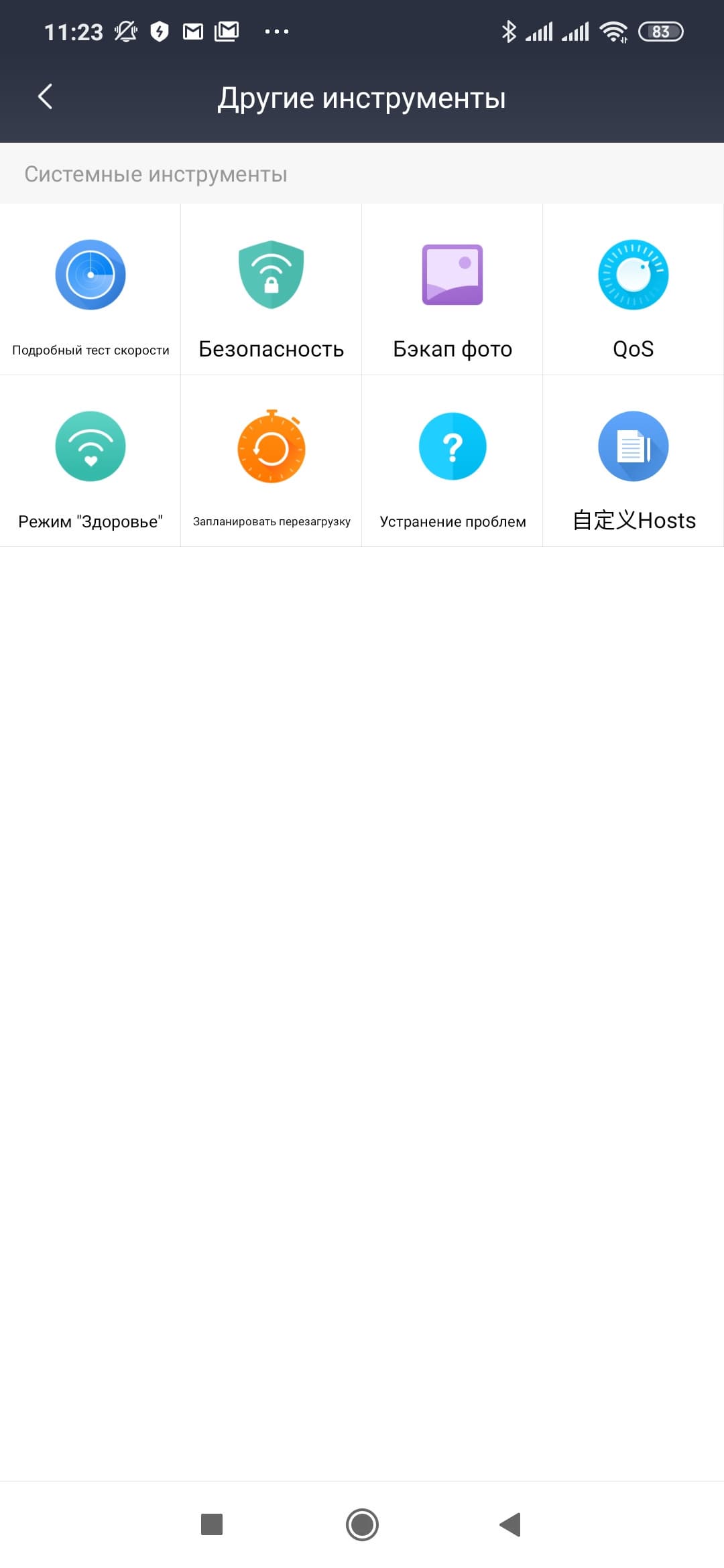 «Другие инструменты» позволяет пользователю провести оперативную проверку скорости подключения роутера к интернету и мобильного устройства к роутеру, настроить дополнительные сервисы защиты на безе технологий Baidu Security (в частности для автоматической проверки трафика на вредоносный код), настроить функцию управления полосой пропускания (QoS) с выбором приоритета и ограничений (в том числе и для гостевой сети), настроить расписание работы Wi-Fi (режим «Здоровье»), составить расписание перезагрузки (если вы не уверены в стабильности устройства).