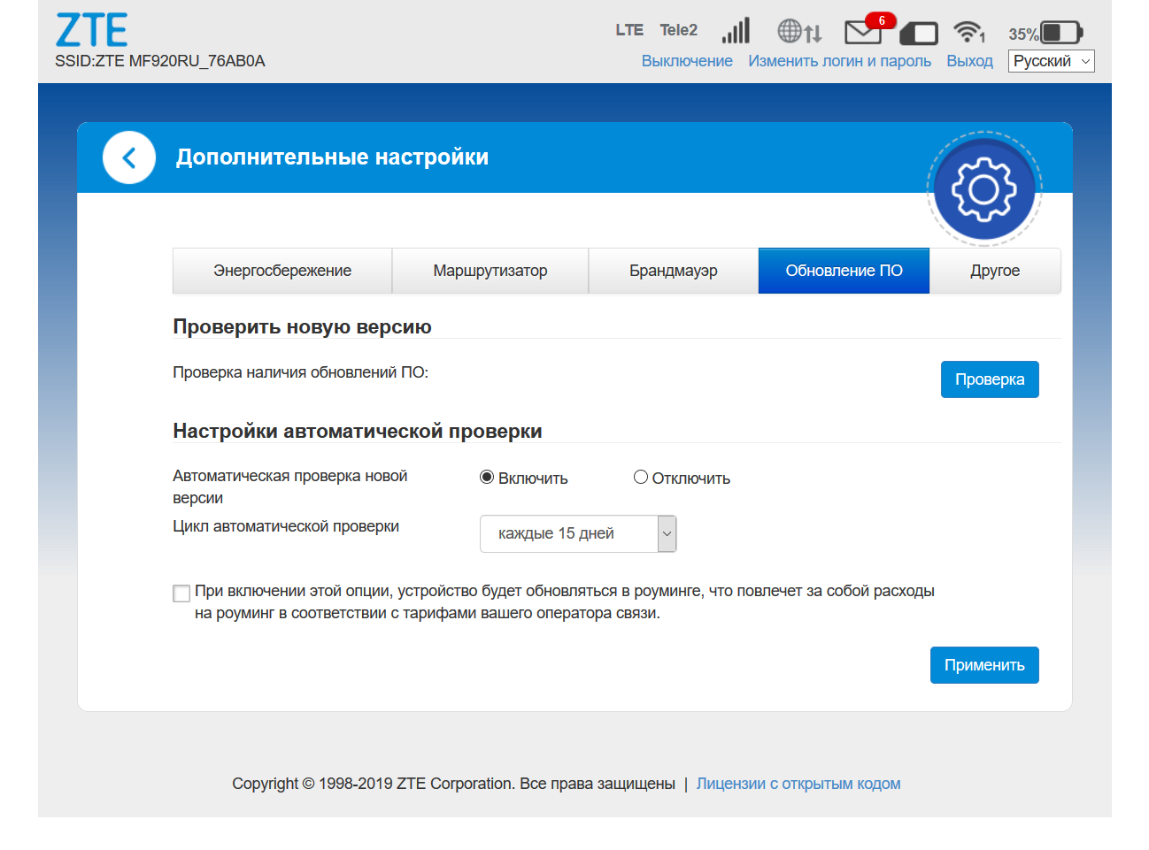 Далее идет страница обновления встроенного программного обеспечения через интернет. При работе в роуминге желательно отключить автоматическую проверку на доступность новых версий.
