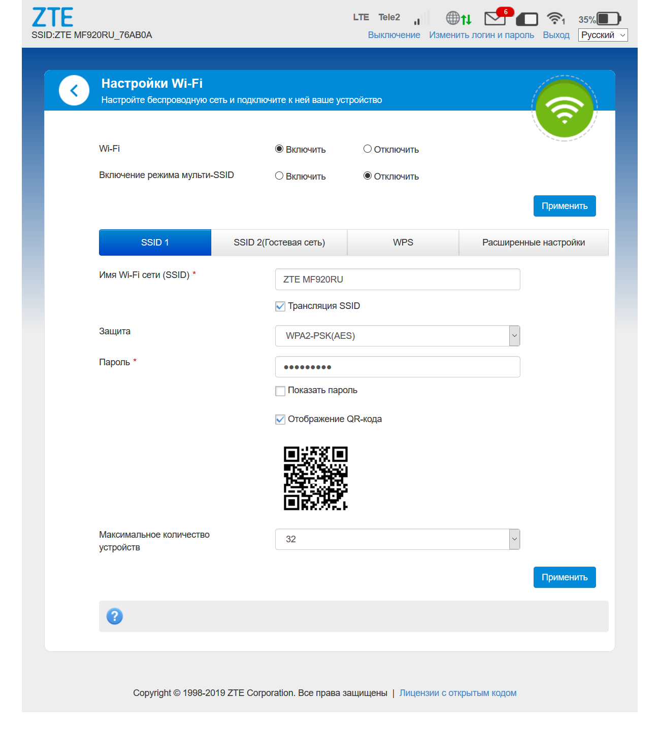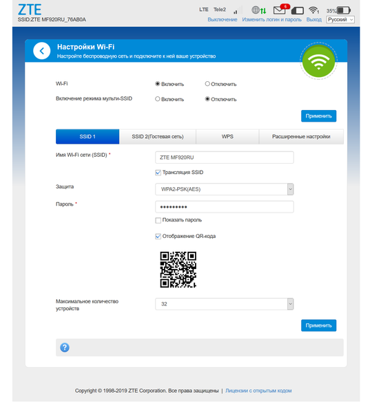 Группа настроек Wi-Fi аналогична тому, что мы обычно видим в домашних беспроводных роутерах. Пользователь может изменить имя и защиту сети (поддерживается открытая сеть, WPA2 и WPA/WPA2 с паролем), запретить трансляцию имени сети, ограничить максимальное число клиентов. В расширенных настройках можно выбрать регион, номер и ширину канала. Здесь же есть пункты для подключения клиентов по WPS. Кроме того, на главной странице есть QR-код с именем и паролем сети для удобного подключения с мобильных устройств.