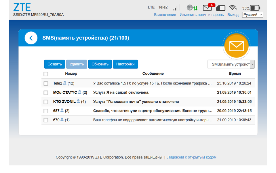 Раздел SMS предоставляет возможности по работе с короткими сообщениями. Вы можете читать присланные вам, удалять их, писать и отправлять собственные. Это позволит вам не пропустить важную информацию от оператора, а также при необходимости управлять своим контрактом. Русский язык здесь поддерживается.