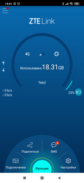 Но конечно, в случае смартфонов и планшетов удобнее будет работать с фирменной программой ZTE Link, доступной для Android и iOS. На стартовой странице отображаются статус подключения, текущие скорости загрузки и передачи, лимит (если установлен), уровень заряда батареи.