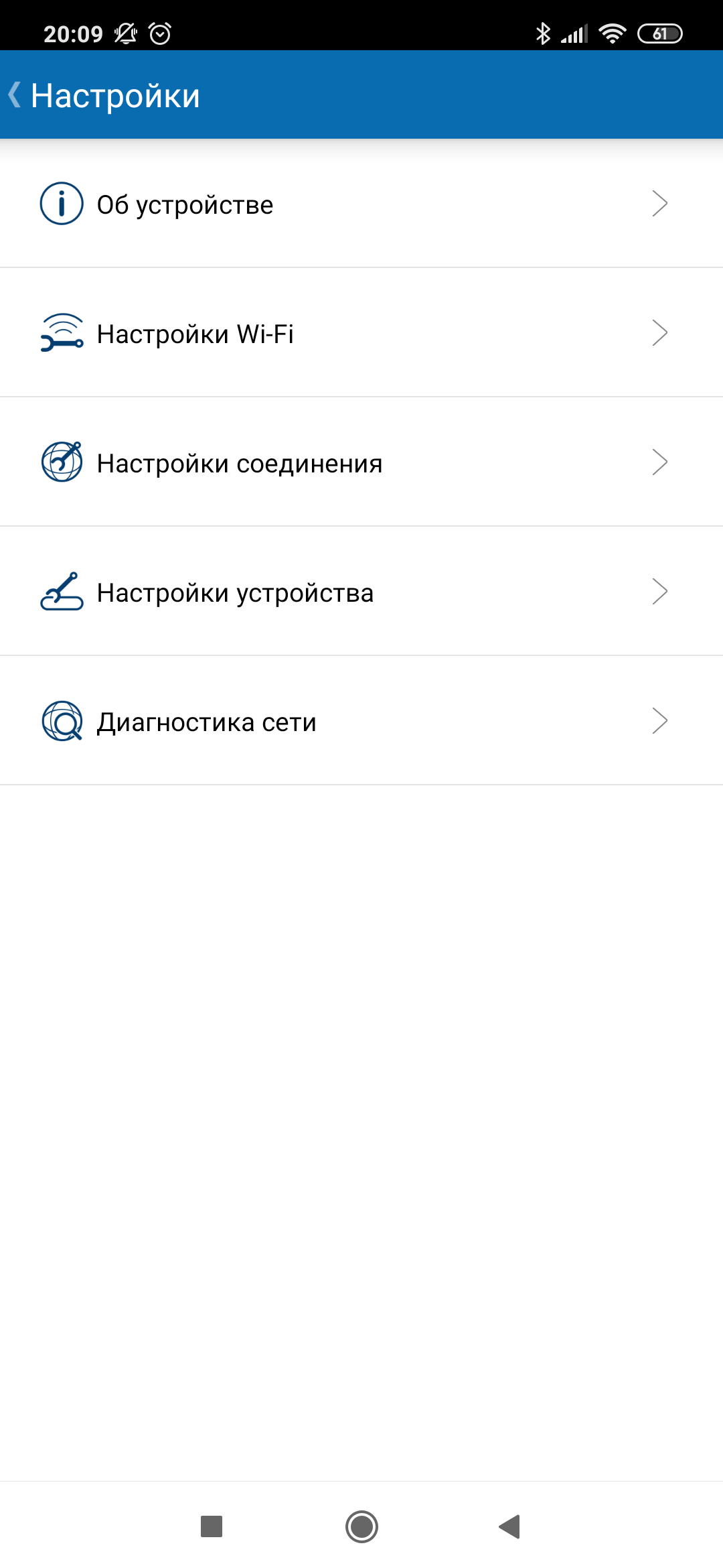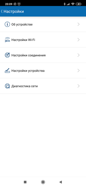 Главное меню программы имеет пять пунктов, из которых интерес представляет только раздел «Настройки». Остальное — выбор языка, два варианта «выхода» и «О программе». В настройках есть большинство тех возможностей, что мы видели в веб-интерфейсе: информация об устройстве, настройки Wi-Fi и сотовой сети, изменение пароля, сброс, перезагрузка и так далее.
