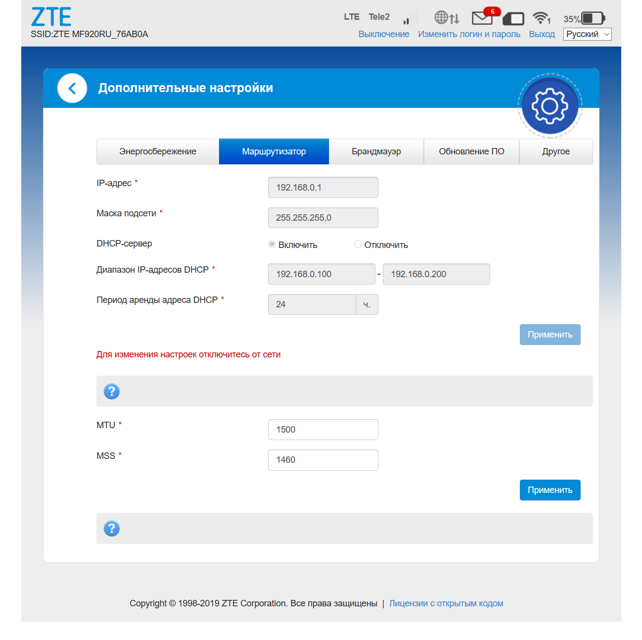 На странице «Маршрутизатор» можно изменить собственный внутренний IP-адрес роутера, установить диапазон адресов для раздачи клиентам по DHCP, выбрать значения для MTU и MSS.
