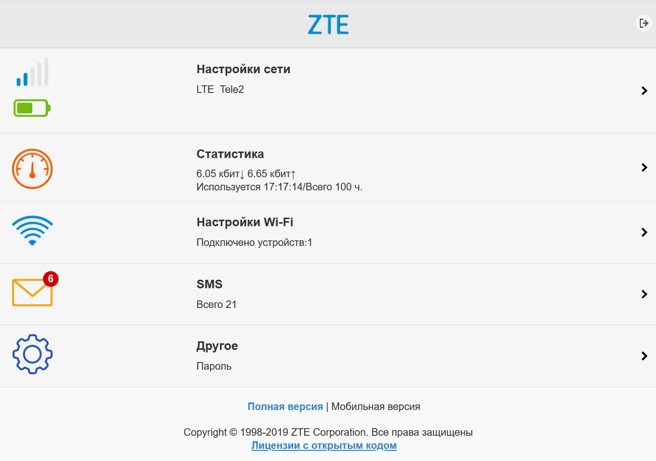 В версии веб-интерфейса для мобильных устройств дизайн был упрощен для более быстрой и удобной работы на небольших экранах. Но все ключевые опции доступны и здесь, в частности настройки сотового подключения и Wi-Fi, статистика, SMS и изменение пароля.