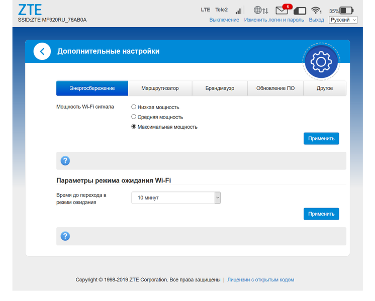 В верхней части страницы находятся несколько информационных значков: статус подключения к сотовому оператору с указанием типа сети, названия оператора и мощности сети, прием и передача данных, наличие новых SMS, статус SIM-карты, число беспроводных клиентов, уровень заряда батареи. Ниже идут быстрые ссылки на выключение питания (на практике эта функция оказалась очень удобной), изменение пароля доступа к роутеру, выход из интерфейса настройки, выбор языка.