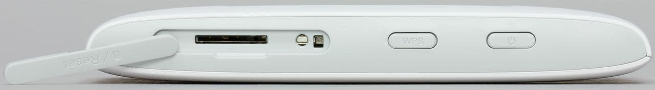 Под крышкой слота находится скрытая кнопка сброса настроек роутера. Рядом мы видим кнопку WPS для оперативного подключения клиентов и кнопку включения питания.