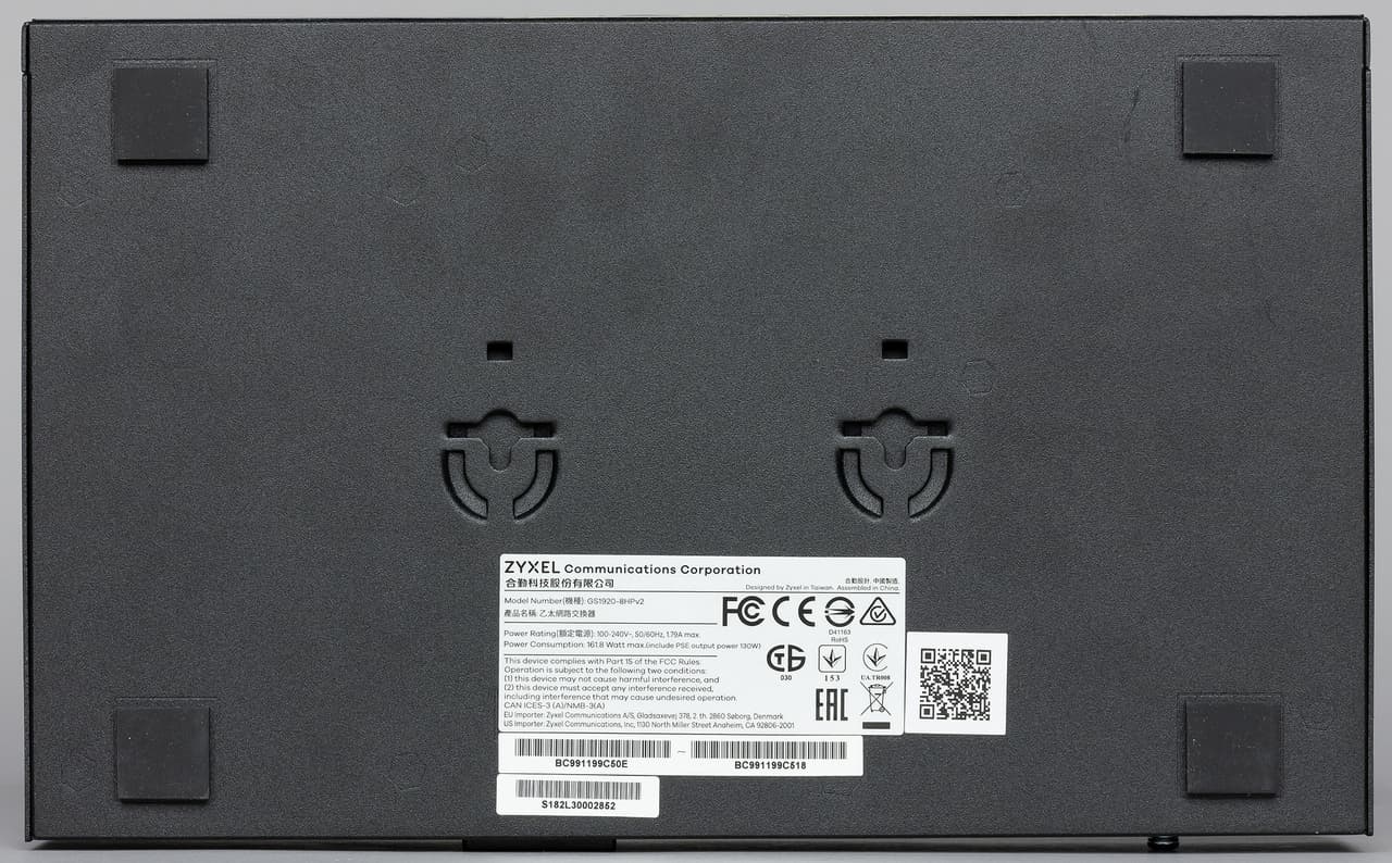 К коммутаторам в сегменте SOHO/SMB обычно редко предъявляются какие-то специальные требования. Но серия GS1920v2 интересна тем, что совмещает Smart-возможности и поддержку PoE/PoE+, что упрощает использование такого сетевого оборудования, как точки доступа и IP-видеокамеры. Комплект поставки состоит из краткой инструкции, набора креплений, резиновых ножек и кабеля питания (блок питания здесь встроенный).