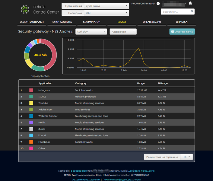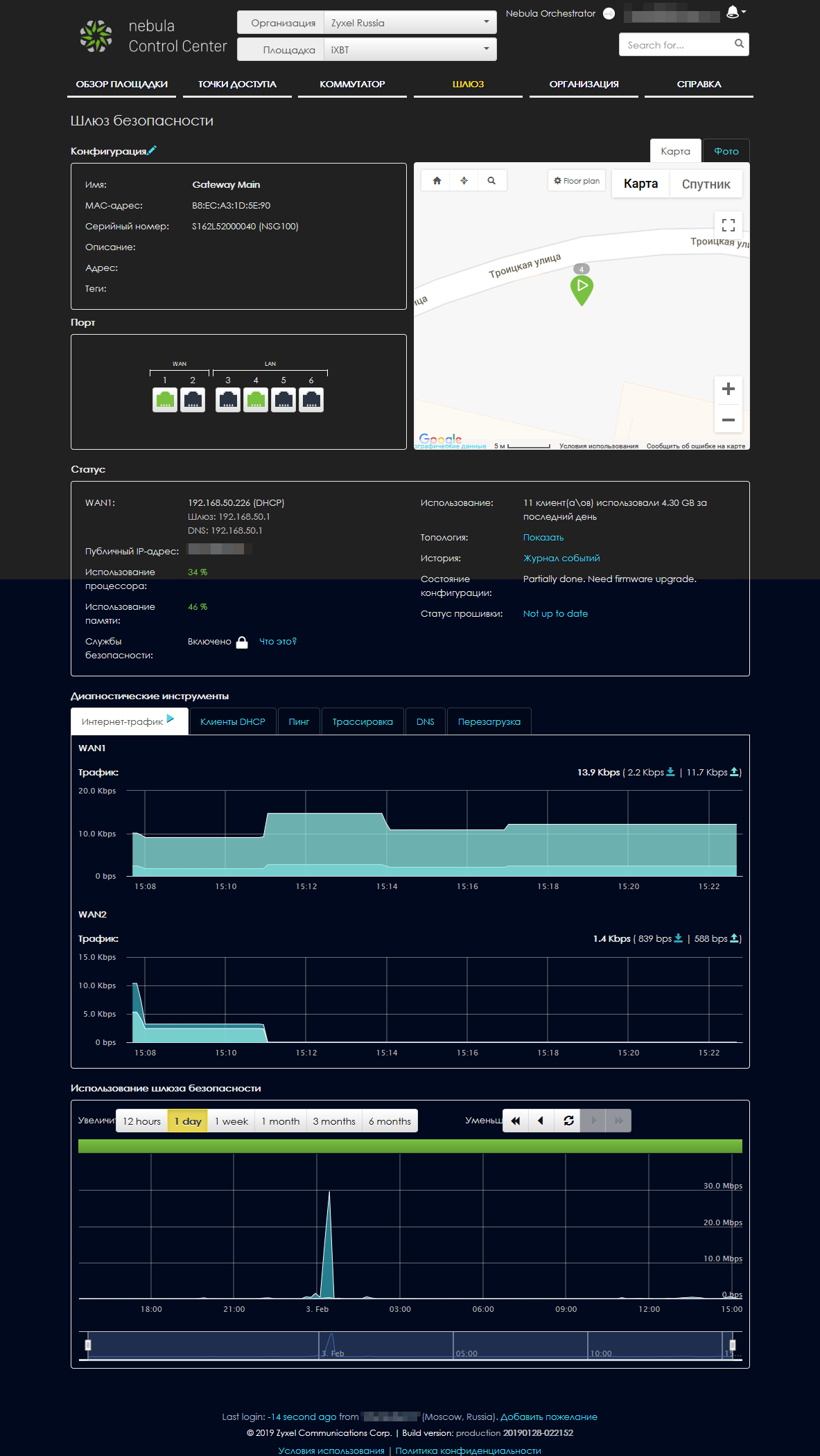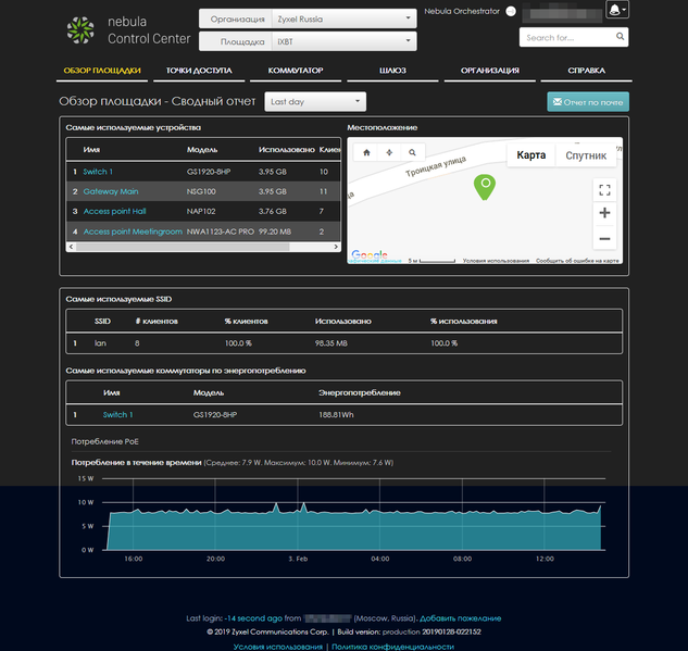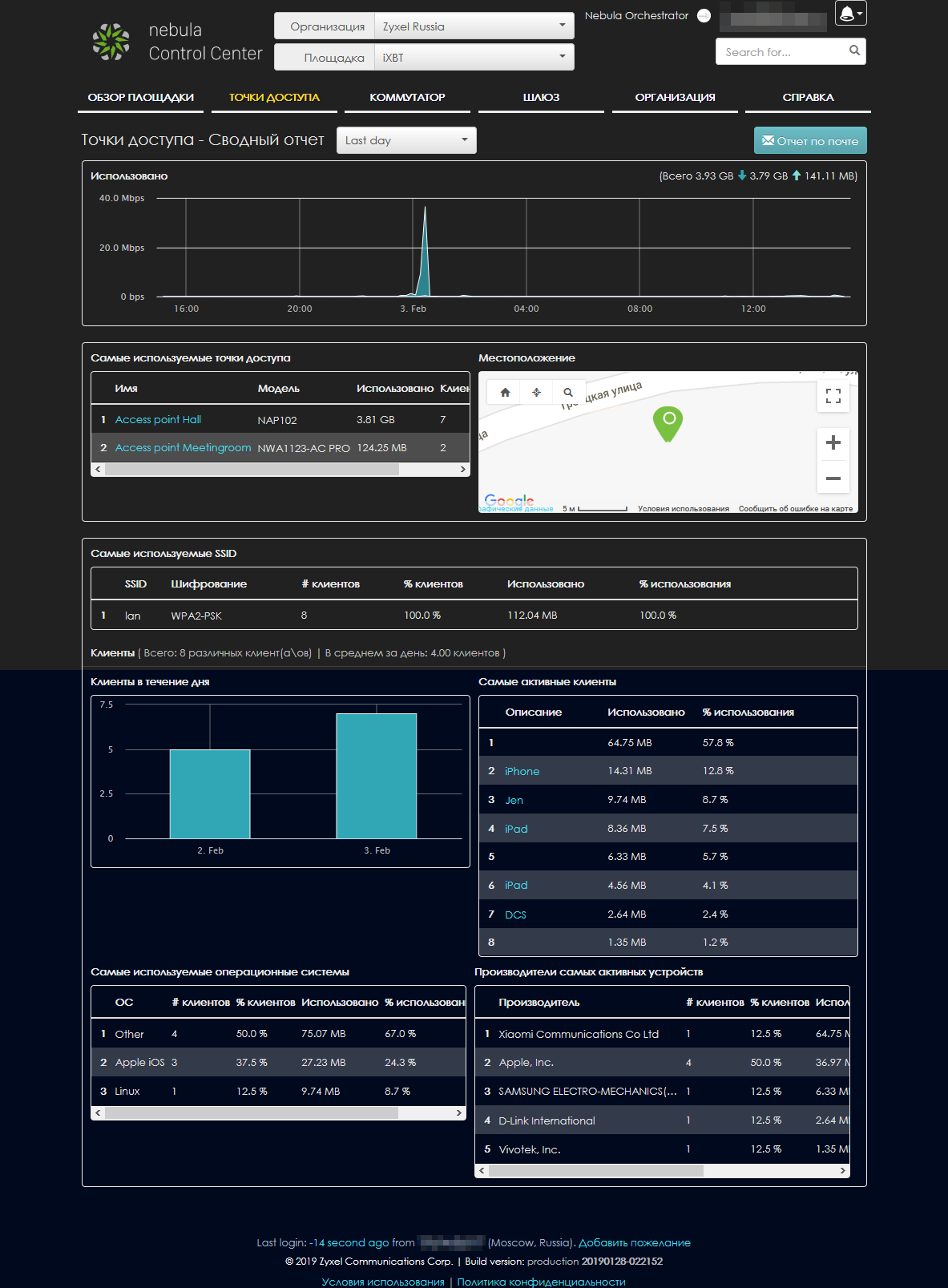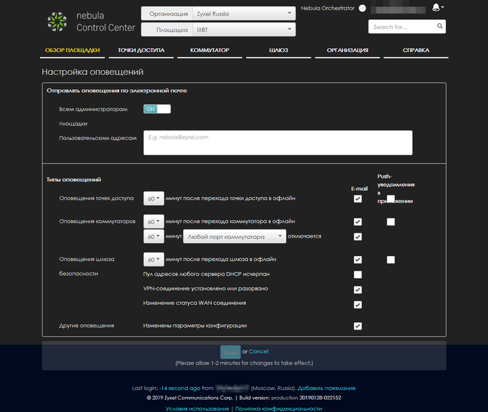 Сама идея объединения ключевых устройств для организации локальной сети в едином портале, безусловно, заслуживает внимания. В сегменте SMB часто применяется разнородное сетевое оборудование, выбранное по критериям стоимости, наличия у поставщика или полученное «по наследству». И при том, что требования и сервисы здесь редко являются сложными и уникальными, управляться с ними бывает очень непросто именно с точки зрения работы внештатного администратора. Zyxel Nebula в данном случае обеспечивает удобство и единый интерфейс для всего сетевого оборудования и может легко масштабироваться от небольшого офиса до сети со многими филиалами. Как мы писали ранее, схему работы исключительно через облако (кстати, сами сервера в настоящий момент находятся в Ирландии) нужно считать особенностью решения и оценивать комплексно исходя из требований конкретного клиента. Заметим, что в облако отправляется информация об устройствах сети, аккаунты, настройки и различная статистика, но, конечно, не сами передаваемые данные. Что из этого считать приватной информацией и готовы ли вы отдавать ее в облако, вы должны определиться самостоятельно. При отсутствии доступа к интернету сама локальная сеть, конечно, будет продолжать работать (в том числе, собирать статистику и журналы, насколько будет хватать памяти). Кстати, производитель говорит и о наличии функции автоматического отката изменений конфигурации, если они привели к потере связи с облачным сервисом.