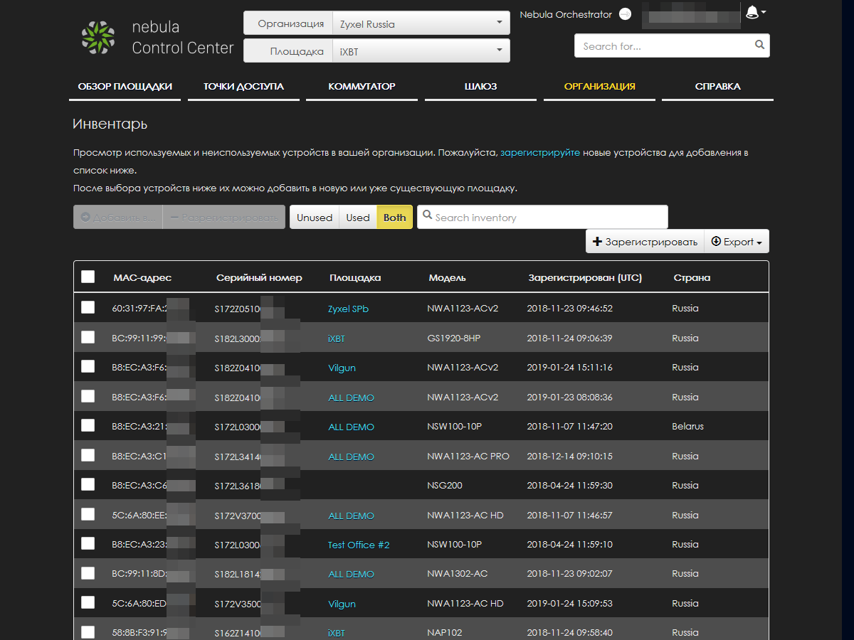 На отдельной странице можно посмотреть полный список всех устройств в организации с указанием их MAC-адресов и серийных номеров, так что инвентаризацию провести несложно.