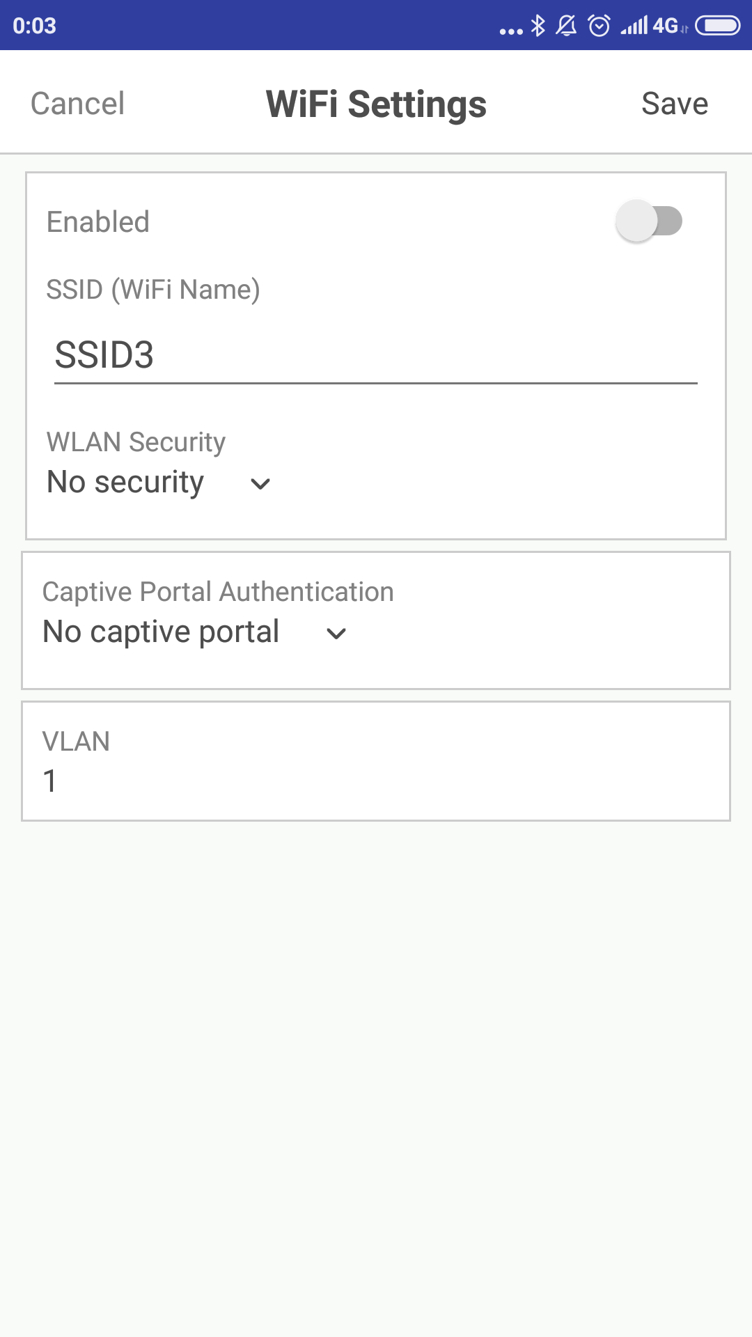 Второй пункт основного меню — настройка точек доступа, а точнее — беспроводных сетей. Здесь представлены все SSID подразделения и есть возможность изменения их параметров. В частности можно оперативно отключить конкретный SSID, создать новую сеть (максимально — восемь), посмотреть или поменять ключ, включить Captive portal, указать VLAN. Заметим, что в приложении доступны не все возможные настройки для беспроводных сетей.