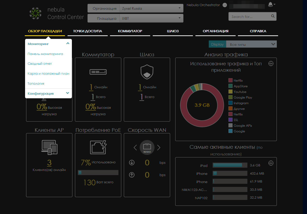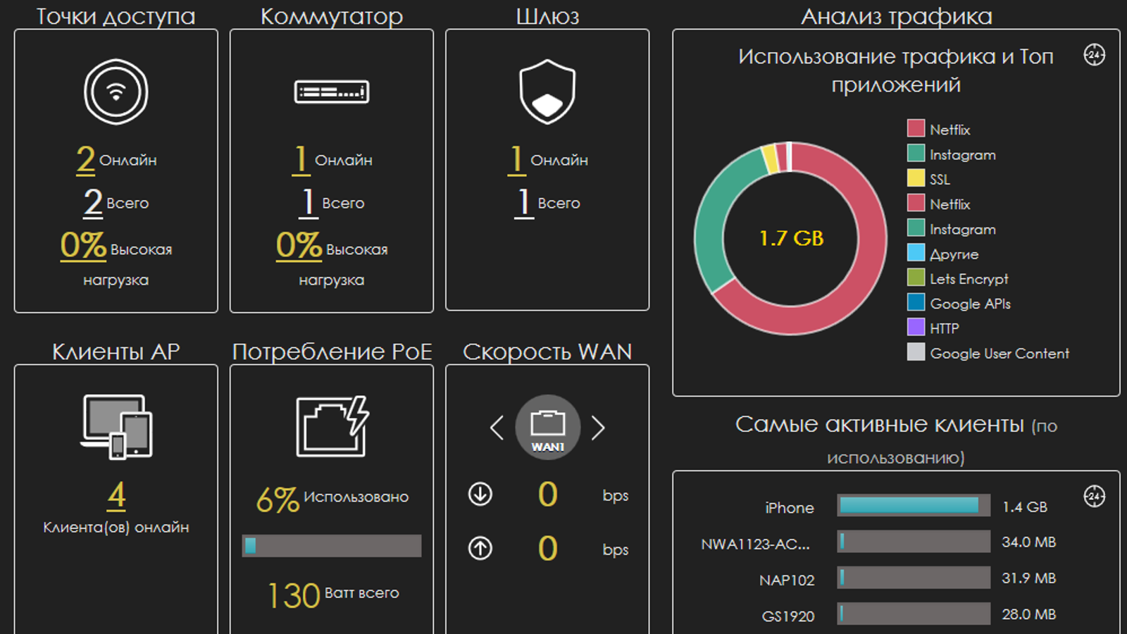 На стартовом экране рабочего стола в приводится ключевая информация для быстрой оценки состояния сети подразделения: общее число и число активных устройств по типам, общая оценка нагрузки, использование канала WAN, число беспроводных клиентов, оценка потребления по PoE, распределение трафика по типам и по клиентам за последние сутки. При этом все поля являются гиперссылками, по которым можно получить более подробную информацию. Непосредственно переход осуществляется на страницы соответствующего оборудования.
