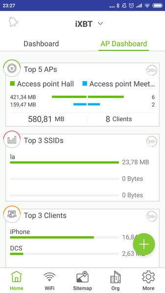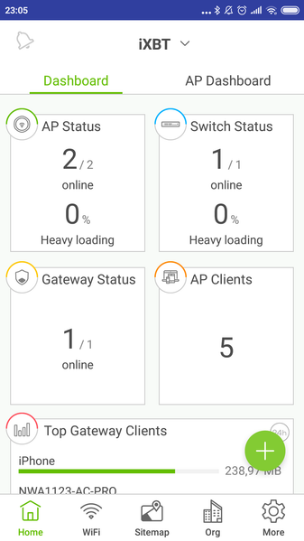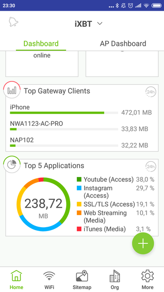 На основном рабочем столе («Dashboard») по аналогии с версией в браузере представлена основная информация о состоянии локальной сети подразделения, включая список точек доступа, коммутаторов, шлюзов и клиентов. Кроме того, есть список максимальных потребителей трафика и распределение трафика по приложениям за последние сутки.
