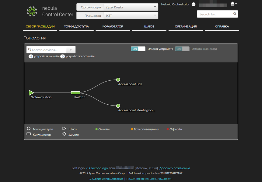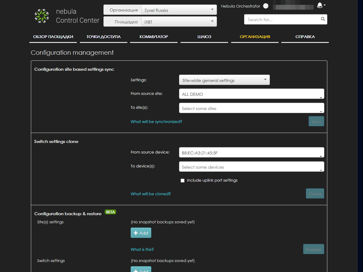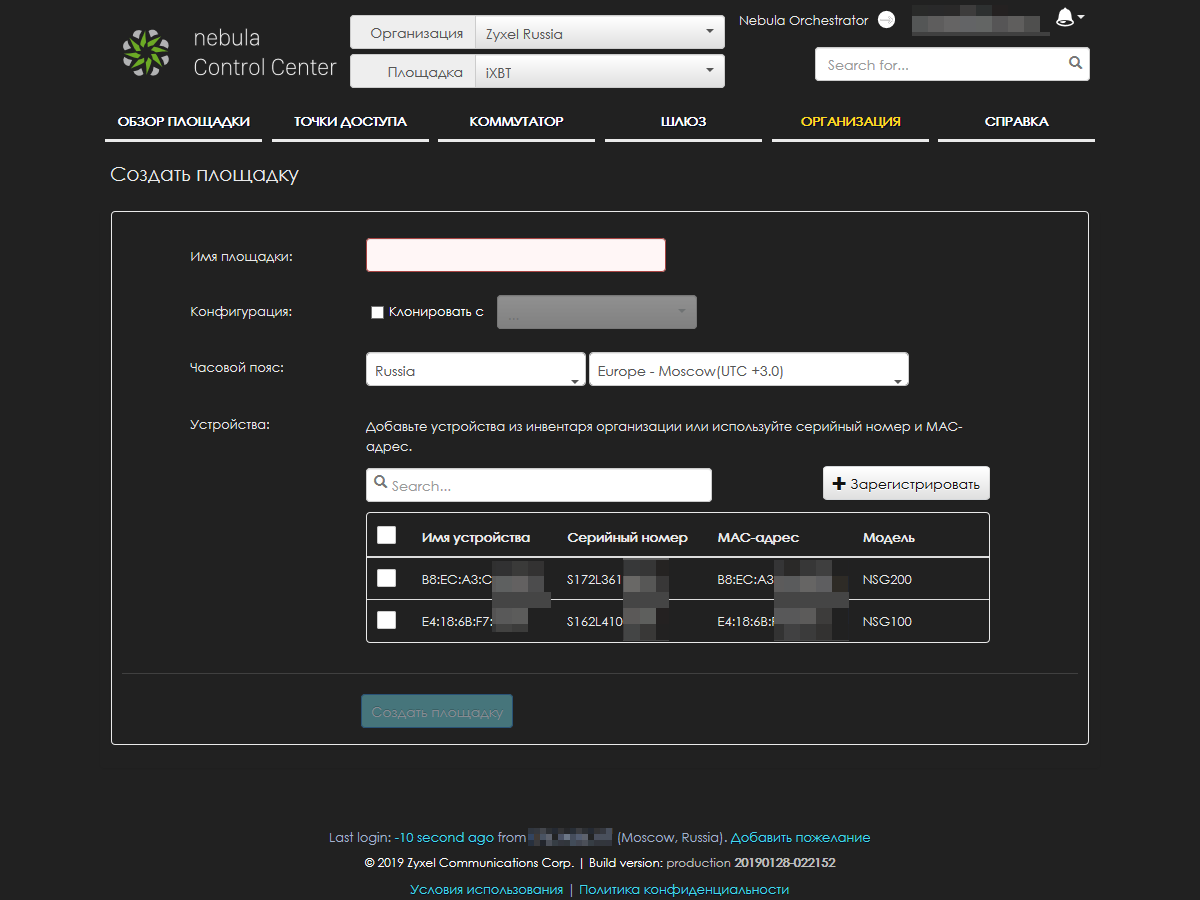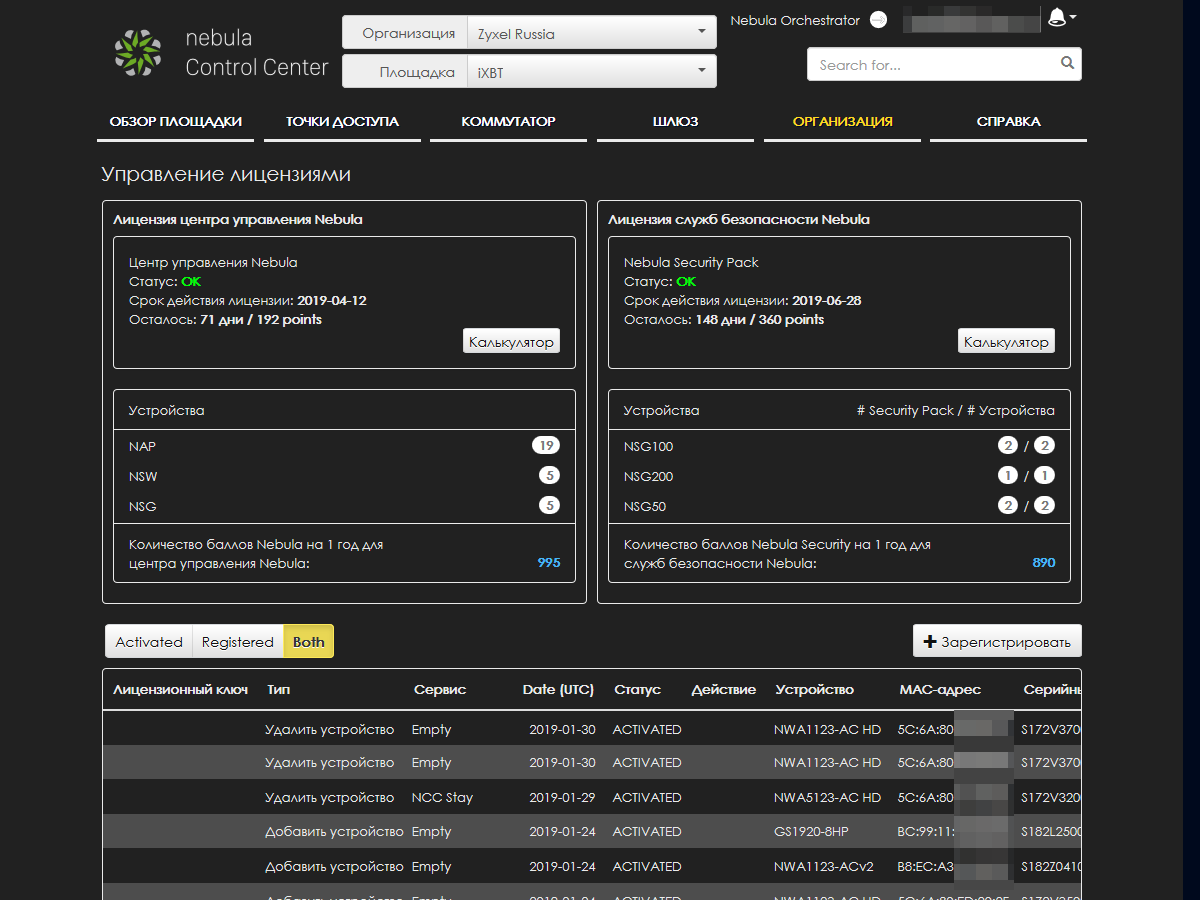 Перед работой с облачным сервисом нужно будет создать в нем ваш аккаунт, для чего потребуется адрес электронной почты. Далее в аккаунте создается «организация» и в ней «сайт» (подразделение). Кстати, на странице https://nebula.zyxel.com/ есть и тестовый доступ, так что можно заранее ознакомиться с возможностями системы. Обратим внимание, что интерфейс сервиса есть как на английском, так и на русском языках, что повышает удобство работы с системой для потенциального пользователя. Для тестирования производитель предоставил нам аккаунт с сайтом в своей тестовой организации. Заметим, что данный сервис доступен как в базовом бесплатном варианте, так и в профессиональном с лицензированием по устройству на год или на все время. Таблица сравнения доступна на сайте производителя. Ключевые отличия платного варианта: хранение журналов в течение года (против недели у бесплатной версии), больше аккаунтов администраторов и пользователей, уведомления, специальные сервисы для крупных организаций. Описание в данном материале относится именно к платному варианту. При этом лицензирование и оплата относятся к организации в целом, а не к ее отдельным отделам.