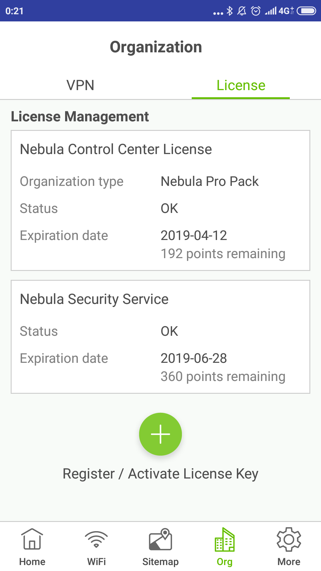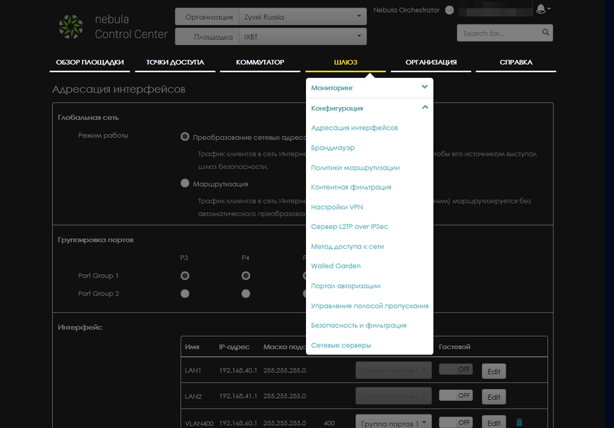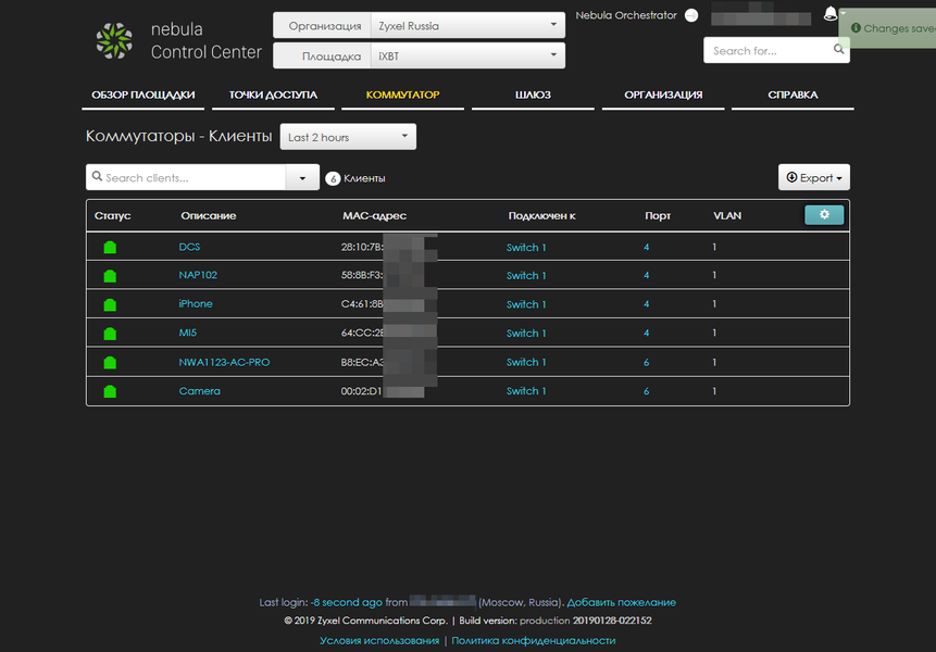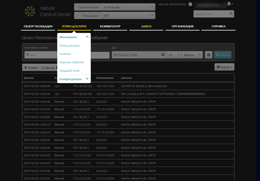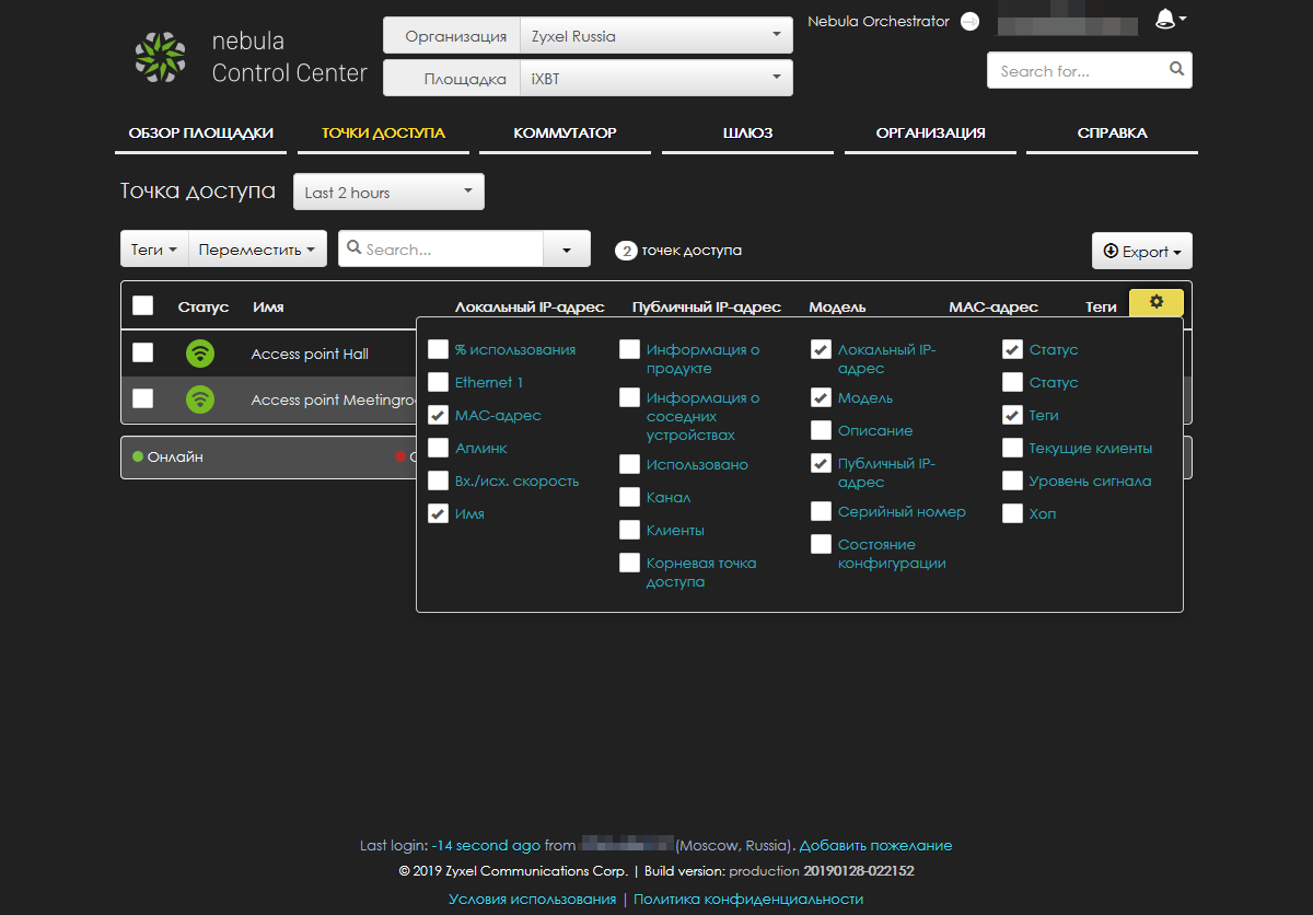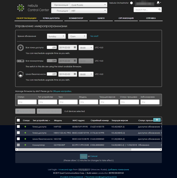 Перед работой с облачным сервисом нужно будет создать в нем ваш аккаунт, для чего потребуется адрес электронной почты. Далее в аккаунте создается «организация» и в ней «сайт» (подразделение). Кстати, на странице https://nebula.zyxel.com/ есть и тестовый доступ, так что можно заранее ознакомиться с возможностями системы. Обратим внимание, что интерфейс сервиса есть как на английском, так и на русском языках, что повышает удобство работы с системой для потенциального пользователя. Для тестирования производитель предоставил нам аккаунт с сайтом в своей тестовой организации. Заметим, что данный сервис доступен как в базовом бесплатном варианте, так и в профессиональном с лицензированием по устройству на год или на все время. Таблица сравнения доступна на сайте производителя. Ключевые отличия платного варианта: хранение журналов в течение года (против недели у бесплатной версии), больше аккаунтов администраторов и пользователей, уведомления, специальные сервисы для крупных организаций. Описание в данном материале относится именно к платному варианту. При этом лицензирование и оплата относятся к организации в целом, а не к ее отдельным отделам.