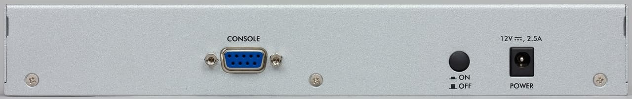 На задней панели есть только вход блока питания, выключатель питания и консольный порт DB9. Как и для другого «взрослого» оборудования, все ключевые подключения и индикаторы находятся на лицевой панели.