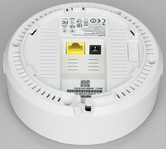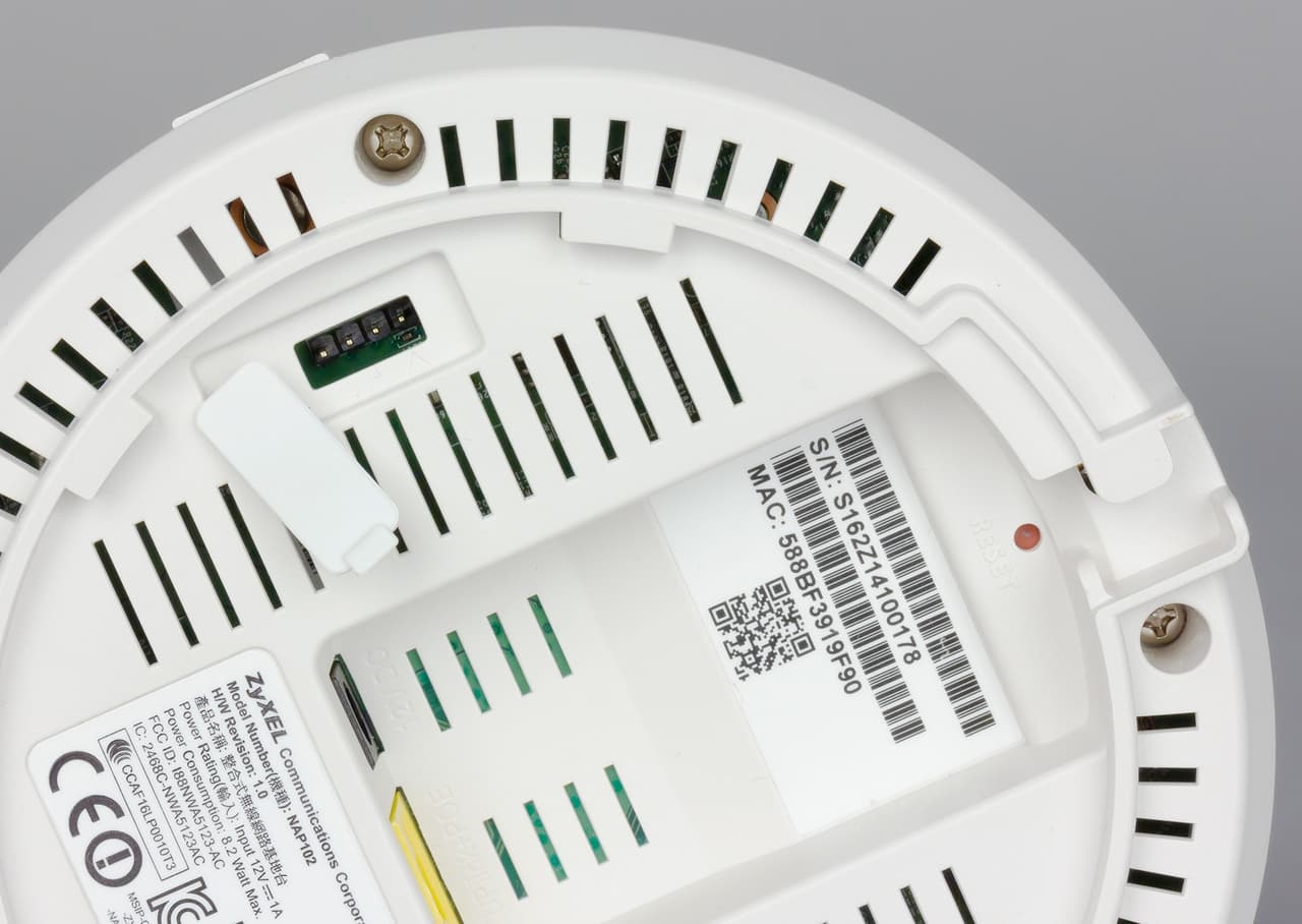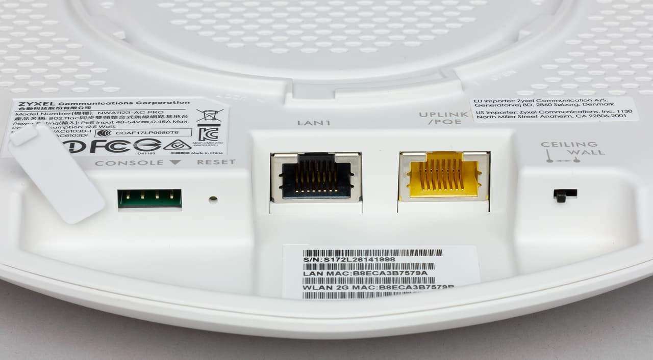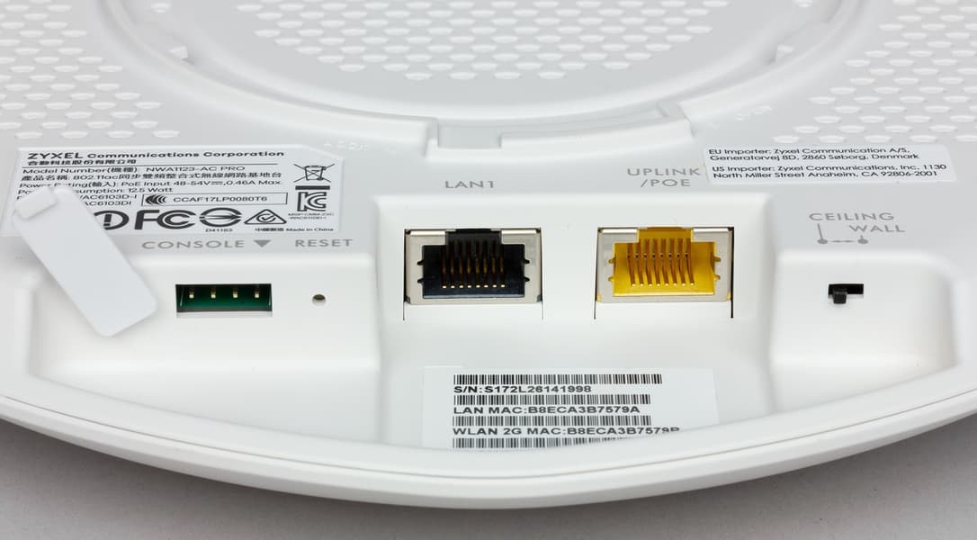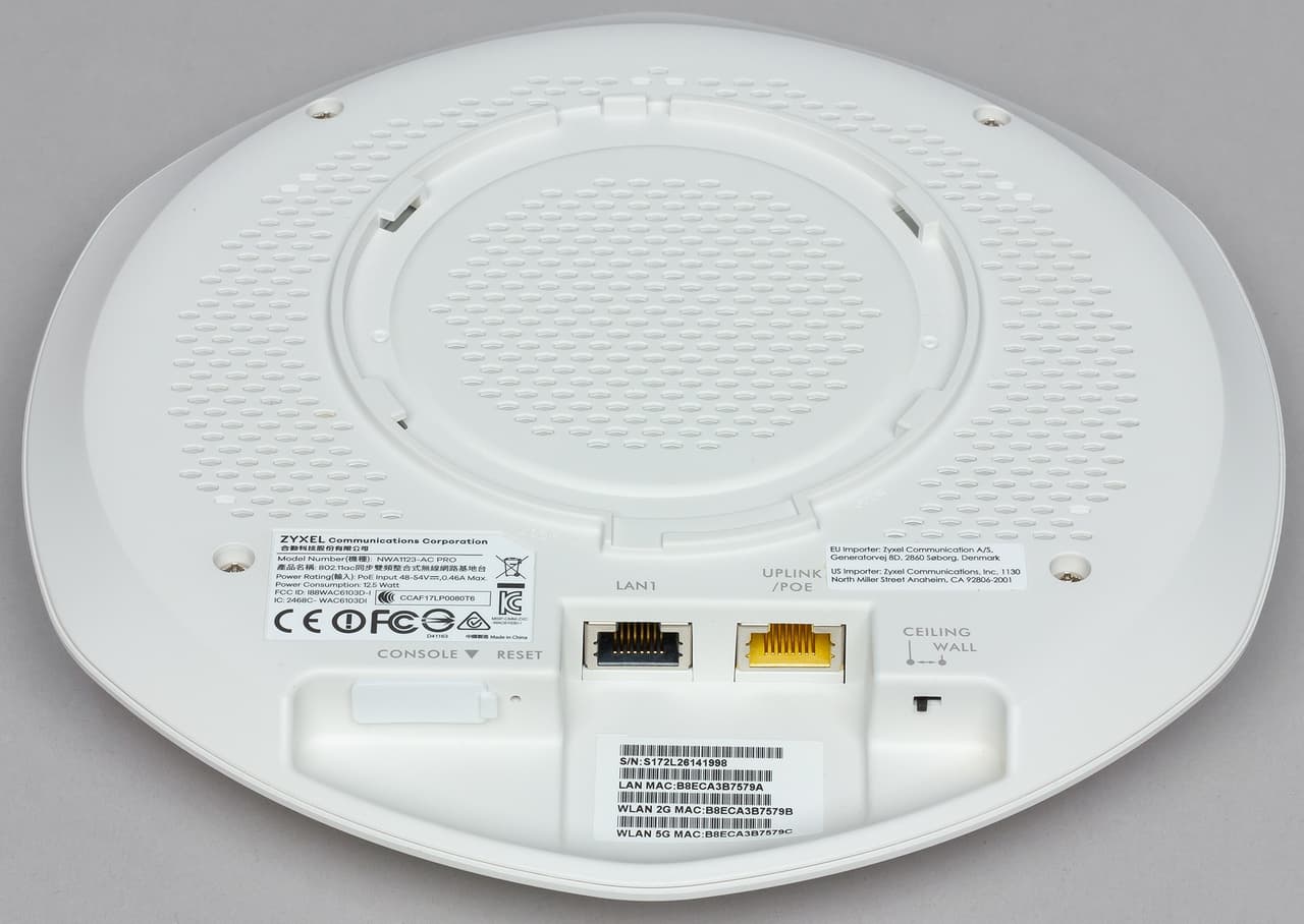 С обратной стороны установлен гигабитный сетевой порт RJ45, вход блока питания, скрытая кнопка сброса и консольный порт под заглушкой. Как и остальное оборудование в этой статье, данная точка доступа предназначена для работы внутри помещений.