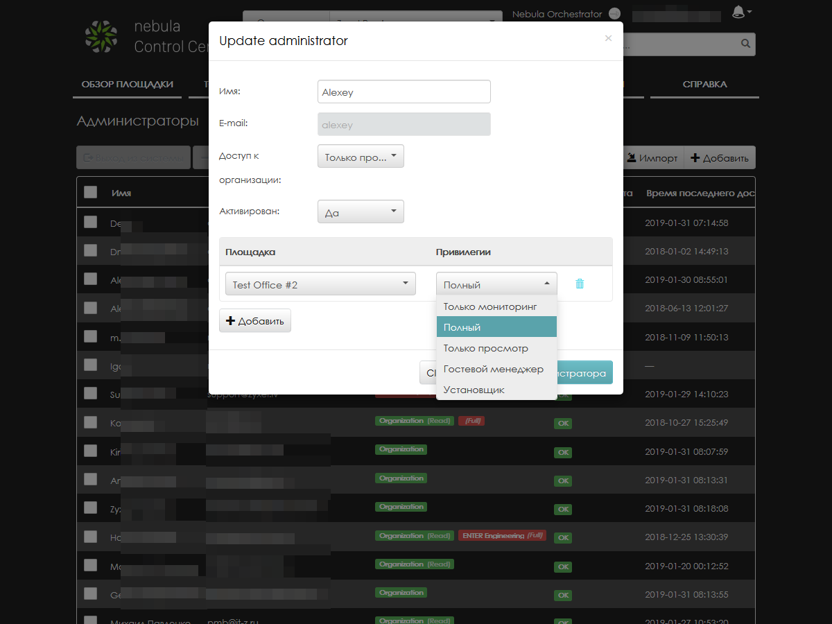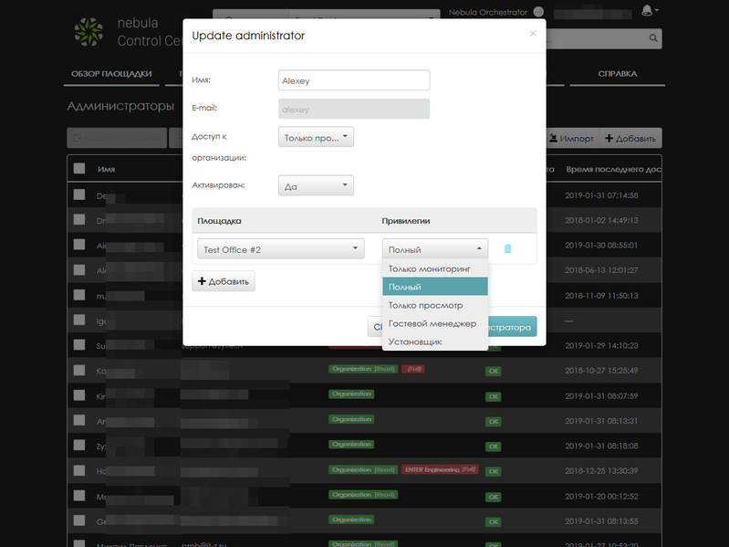 Для каждого из них доступны настройка режима контроля организации в целом (нет доступа, только просмотр, полный доступ) и далее можно добавить нужное число сайтов (подразделений) в режимах «только мониторинг», «полный», «только чтение», «гость» и «установщик». Так что при необходимости, главный администратор может делегировать полномочия на управление сетью удаленного офиса другому сотруднику.