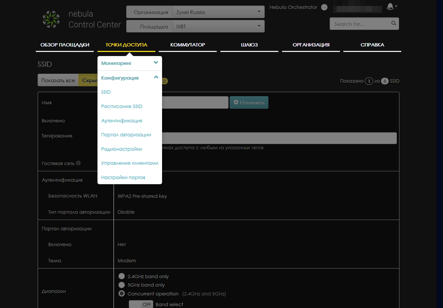 Точки доступа подразделения автоматически используют единые настройки SSID для обеспечения роуминга беспроводных клиентов. Предусмотрено создание до восьми SSID, в опциях которых кроме имени и защиты можно выбрать диапазон, ограничить скорость, включить тегирование VLAN, для гостевых сетей предусмотрена L2 Isolation, многие модели поддерживают протоколы быстрого роуминга 802.11r/k/v. Поддерживается настройка расписаний для работы беспроводных сетей, распространенные варианты аутентификации клиентов, включая встроенный или внешний портал. Заметим, что можно использовать с Nebula только точки доступа и включить в них сервисы аутентификации для беспроводных сетей общего использования согласно законодательству РФ. В крупных сетях можно использовать функции балансировки для распределения клиентов по точкам доступа и отсечения клиентов со слабым сигналом с целью обеспечения максимальной производительности.
