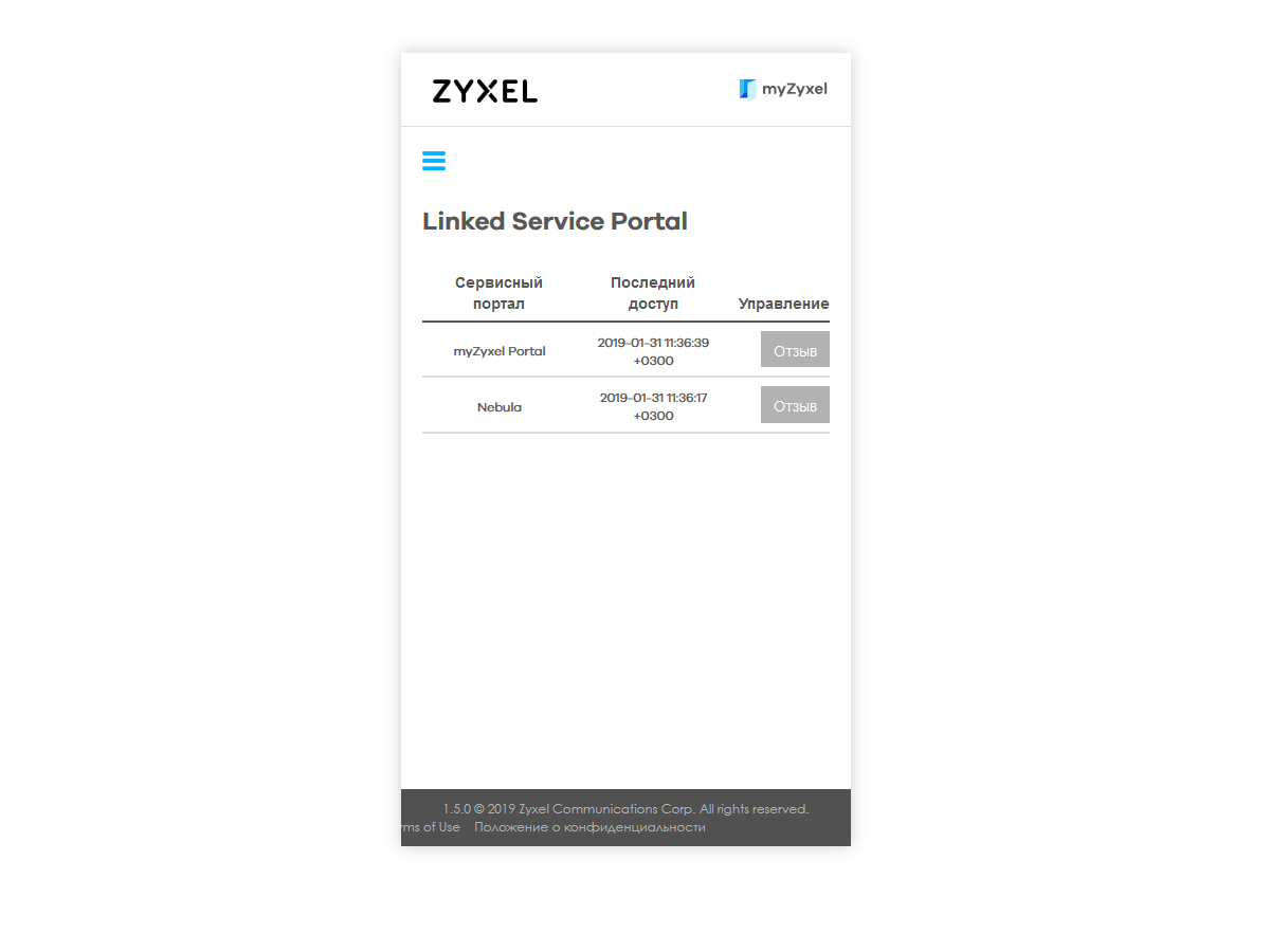 Что касается собственно аккаунта пользователя, то в облачном интерфейсе можно выбрать язык интерфейса, проверить даты и адреса последних входов в систему, просмотреть список сессий. А сам аккаунт пользователя можно изменить уже на портале myZyxel. В частности, на нем настраивается двухфакторная аутентификация и связи с другими порталами.