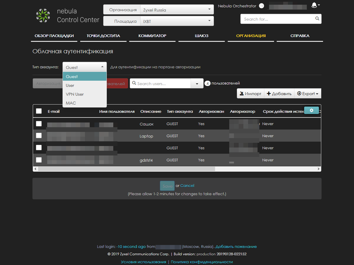 На странице «Cloud authentication» можно управлять аккаунтами для различных сервисов для организации в целом: гостевого портала, VPN, 802.1x, MAC-аутентификации. При этом предусмотрены операции импорта и экспорта списков.