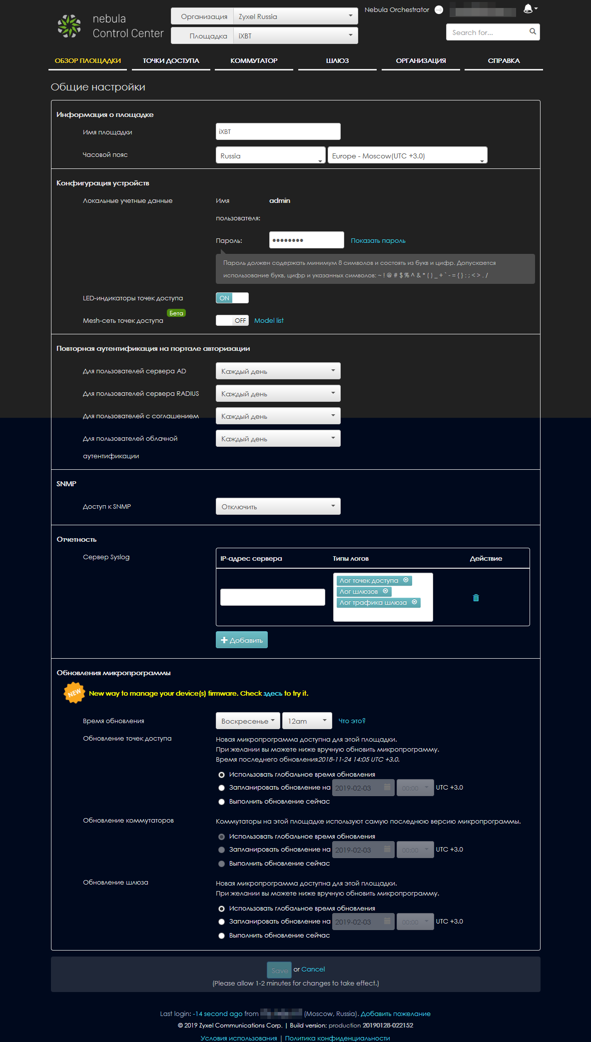 При создании новой сети стоит заглянуть и в раздел «Обзор площадки» → «Конфигурация». Здесь можно настроить глобальные параметры сети, включая активность индикаторов точек доступа, политики повторных аутентификаций, сервер syslog для централизованного хранения журналов, включить SNMP, указать время и частоту обновления прошивок.