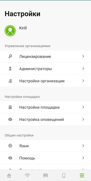 В мобильном приложении можно также осуществлять некоторые операции по управлению аккаунтом, в частности предоставить права администрирования на площадки, настроить Push-оповещения об отключении устройств от облака, управлять лицензиями и подписками.