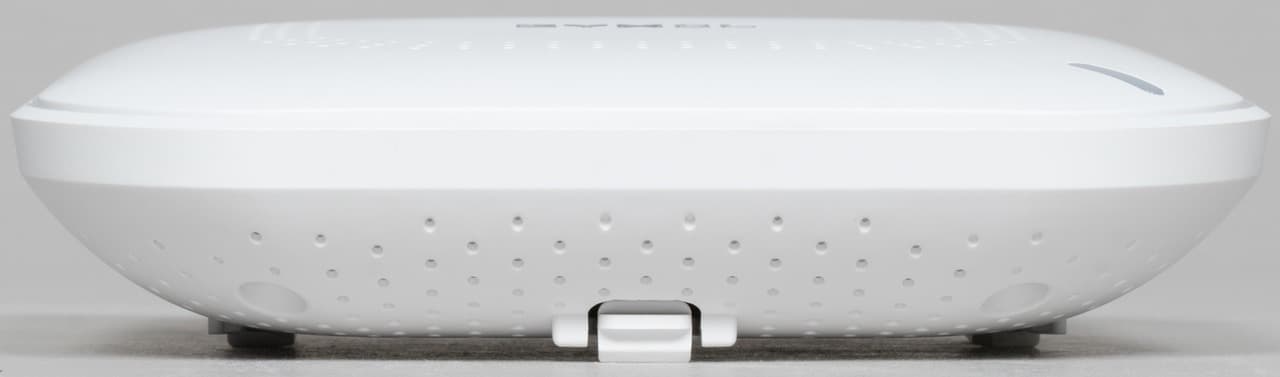 На условно верхней части в центре мы видим логотип производителя. Вокруг него идут отверстия вентиляции, а в одном из углов находится единственный многоцветный индикатор состояния точки доступа. Он достаточно крупный и яркий, так что будет виден издалека.