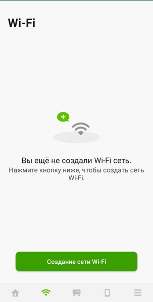 Переходим в мобильном приложении на вторую страницу, выбрав значок Wi-Fi в нижней строке, и создаем новую беспроводную сеть.