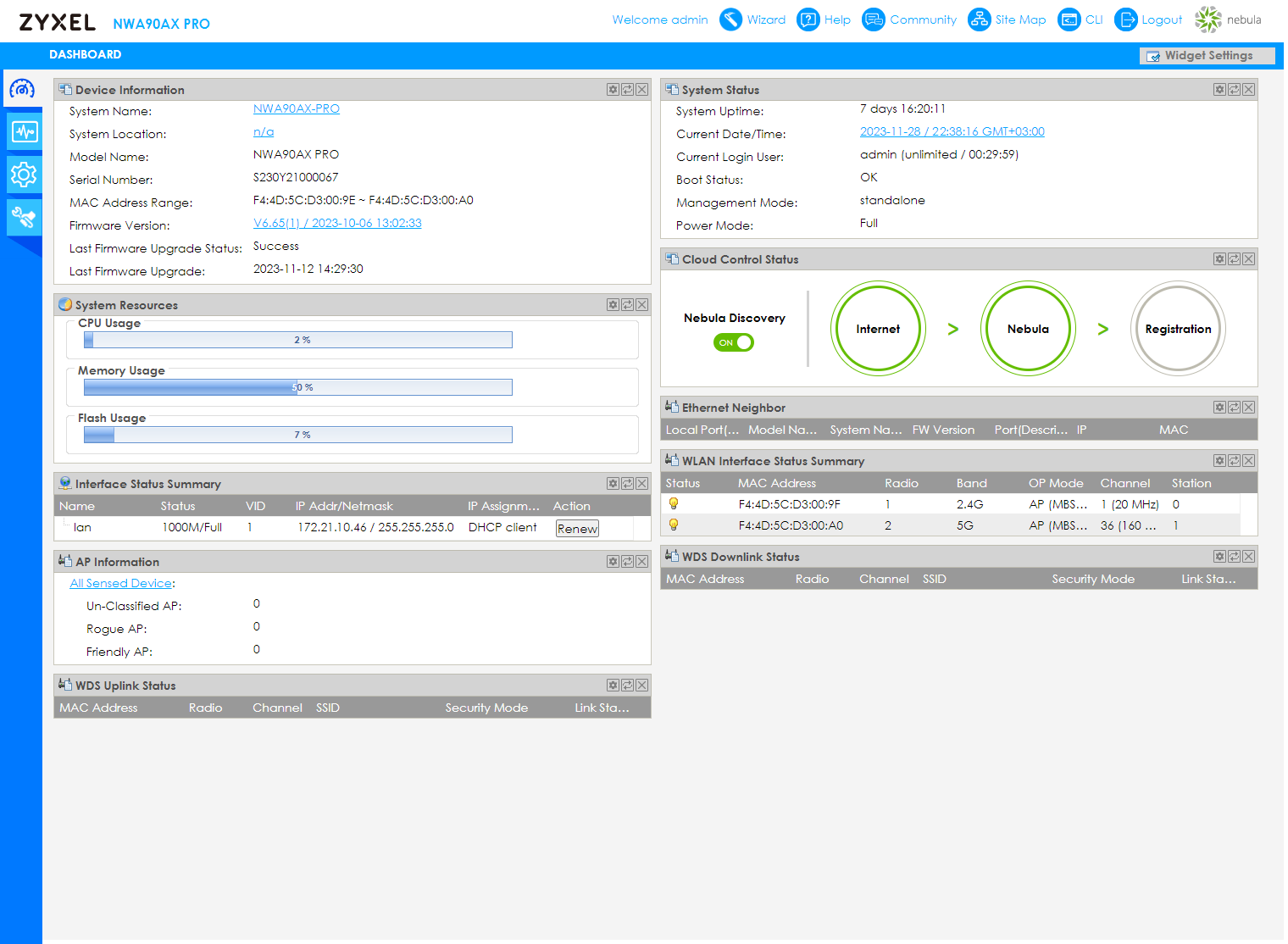 С точки зрения встроенного программного обеспечения модель мало отличается от устройств верхнего сегмента этого производителя. Здесь есть управление через браузер и CLI, а также поддержка облачного сервиса Nebula. Список возможностей и настроек характерен для бизнес-сегмента и предоставляет необходимую гибкость и управляемость.