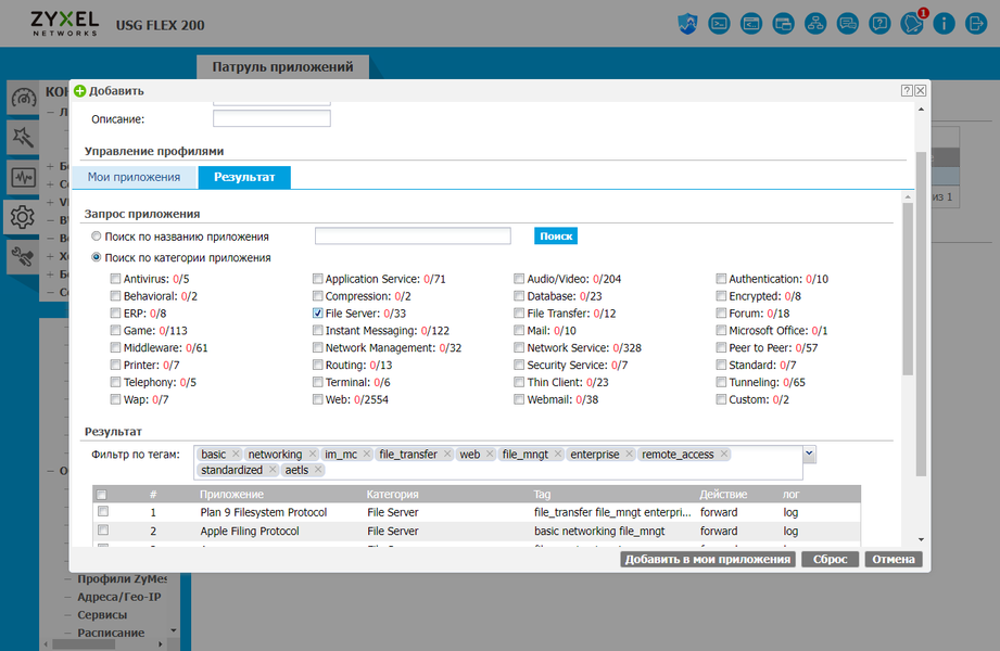И если задачи маршрутизации и удаленного доступа сегодня могут быть реализованы различными продуктами, то межсетевой экран класса NGFW — это уже совсем другая история, требующая высокой компетенции от разработчиков. В решениях Zyxel USG Flex реализованы такие сервисы, как система предотвращения вторжений, контроль приложений, антивирус, антиспам, контентная фильтрация, определение аномалий трафика, контроль сессий, а также SSL-инспекция. При этом базы сигнатур регулярно обновляются производителем на основе подписки. Для настройки работы системы используется принцип объектов, а в правилах могут быть использованы такие параметры, как пользователи и группы, адреса, подсети (включая географическое распределение), сервисы и расписания. Важным элементом системы защиты являются функции отчетности и автоматического реагирования на угрозы.