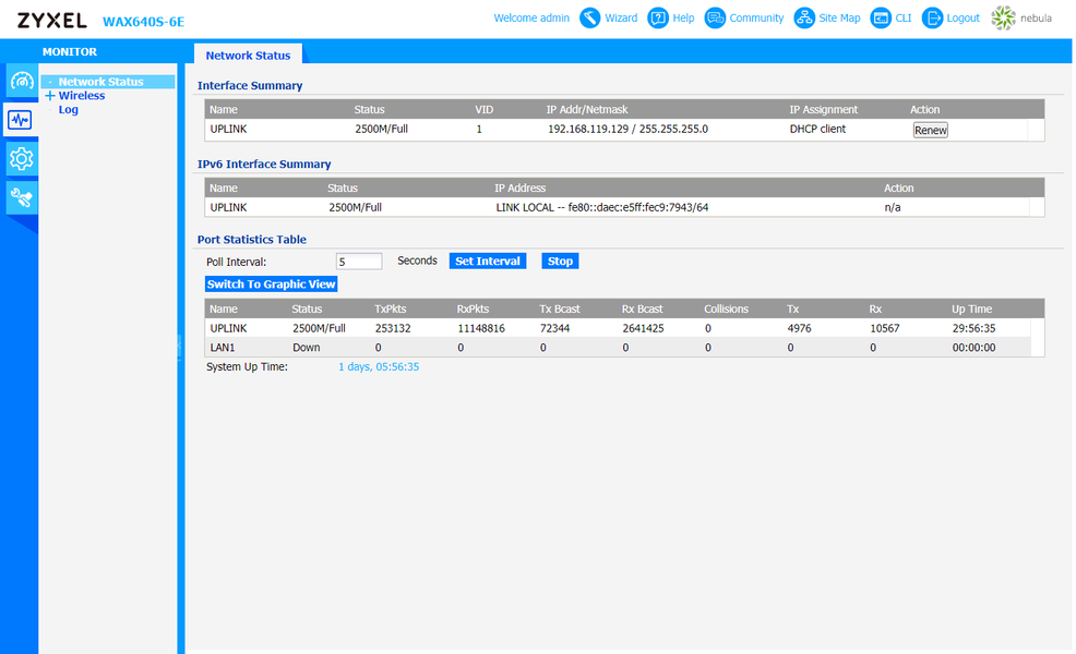 В верхней строке мы видим несколько пунктов общего назначения — мастер настройки базовых параметров точки доступа, ссылки на онлайн-ресурсы поддержки, меню быстрой навигации, встроенный доступ к CLI, переход к облачной системе Nebula. В левой части окна — четыре закладки основного меню. Первая — информационная страница состояния устройства с большим количеством информации. Некоторые подсвеченные пункты являются ссылками на другие страницы интерфейса.