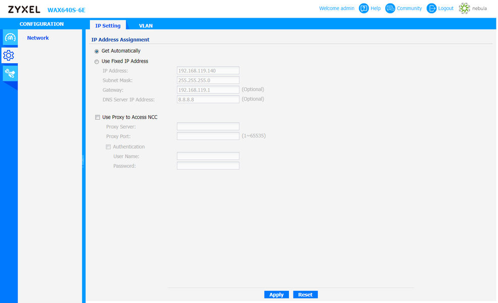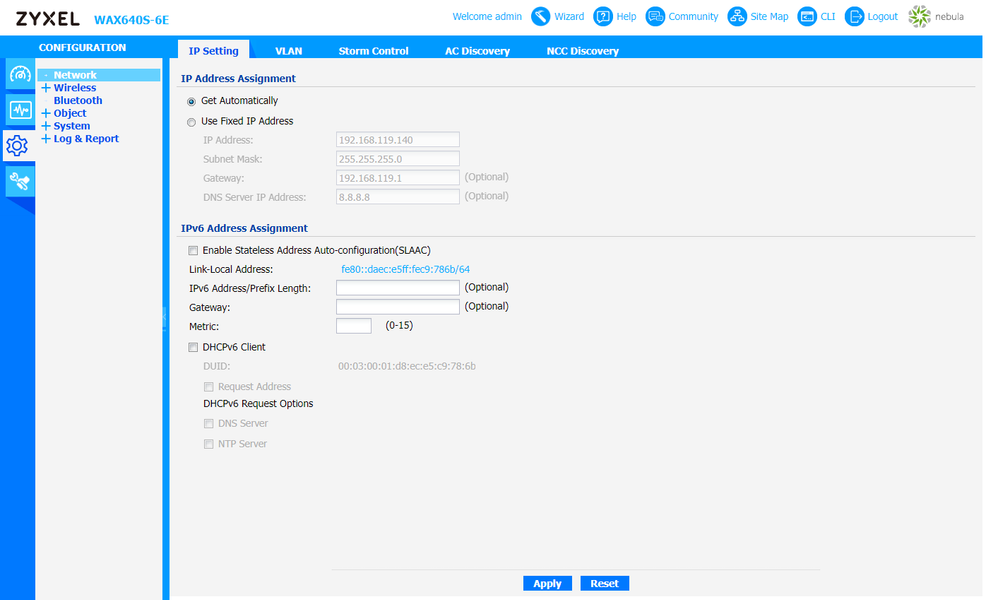 На первой странице настраиваются основные параметры сетевого подключения — собственный IP адрес точки доступа (есть поддержка DHCP и IPv6), виртуальные сети VLAN, защита от широковещательного шторма (детальные настройки сервиса доступны только в CLI), подключение к контроллеру и Nebula. Отметим, что работать с облачным контрольным центром можно и через прокси-сервер.