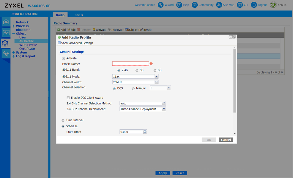 В профиле точек доступа есть две страницы. На первой задается профиль непосредственно «радио», включающий в себя диапазон (2,4, 5 или 6 ГГц), режим (протокол), ширину и номер канала, а также другие параметры. Данные профили будут применяться к радиоблокам соответствующего диапазона и по понятной причине только один в каждый момент времени.