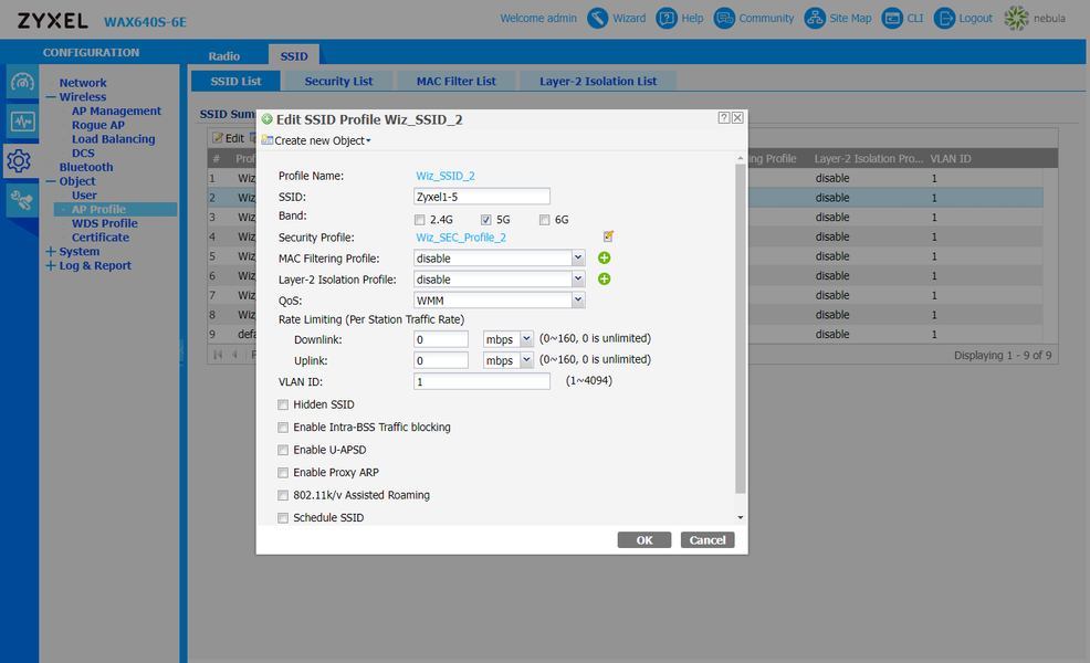 На второй странице настраиваются профили SSID, которые могут быть активны и одновременно. В каждом указывается имя беспроводной сети, профиль безопасности, диапазоны работы, ограничения на скорости каждого клиента, фильтры MAC, класс QoS и другие параметры.