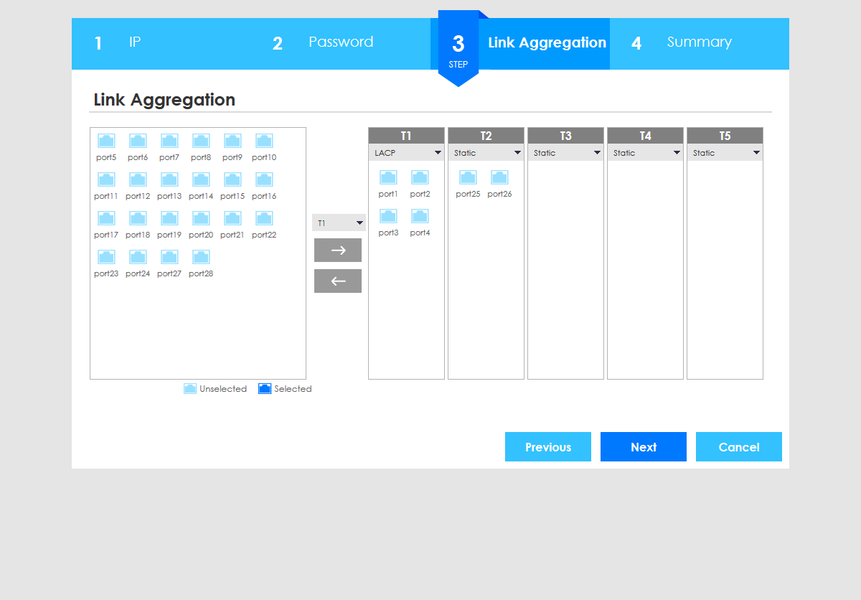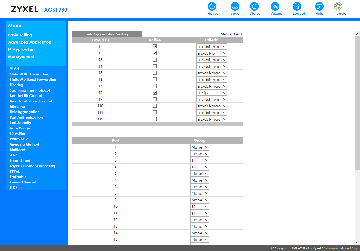 Вторая функция — объединение портов для увеличения общей пропускной способности. Например, это может использоваться с серверами или сетевыми накопителями, в которых установлено несколько сетевых адаптеров. В данном устройстве можно создать до двенадцати групп, для каждой выбрать один из режимов распределения пакетов, а также включить LACP.