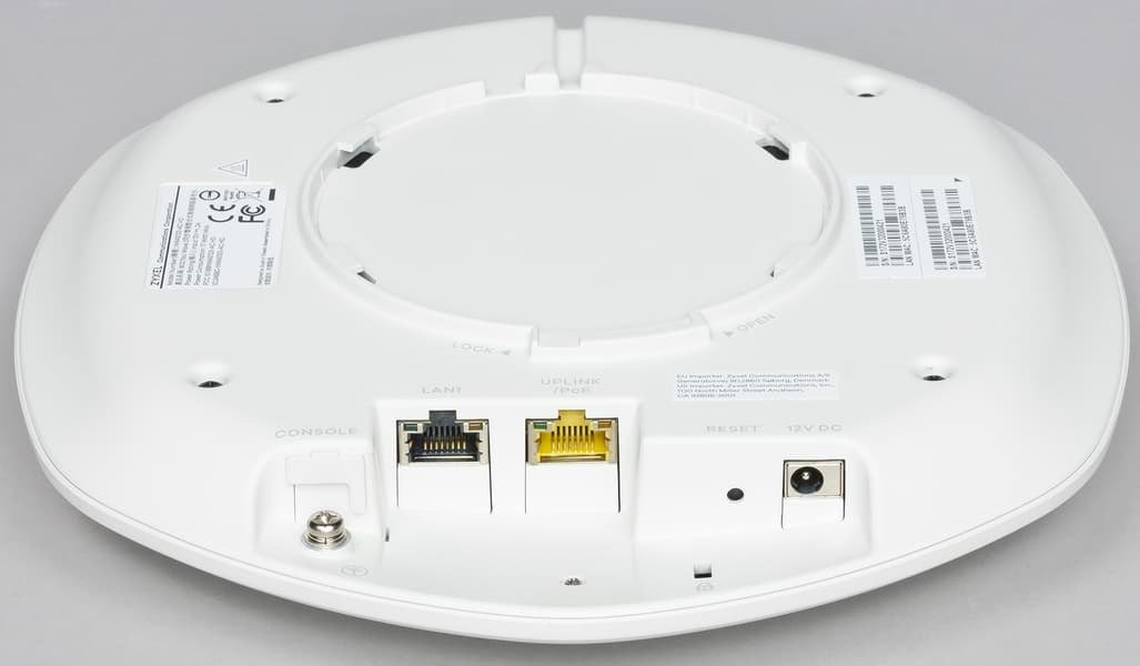 Крепление осуществляется через специальную переходную пластину из пластика. В ней есть два отверстия для шурупов, а точка доступа закрепляется путем поворота и держится на защелке. Никакой дополнительной фиксации винтом не предусмотрено. Демонтировать точку можно без специальных инструментов. Нужно будет только отжать защелку тонким длинным предметом. На нижней стороне точки доступа предусмотрена наклейка с ее серийным номером и MAC-адресом. Точнее даже две — одна постоянная, а вторая может быть легко отклеена для отчетности.