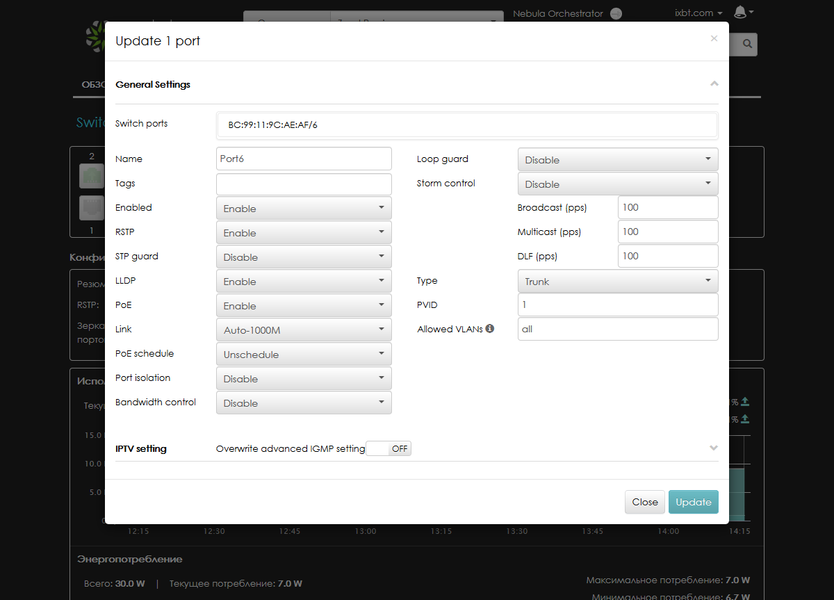 И только при щелчке на значке карандаше после слова «Конфигурация» наконец открывается окно с настройками порта. В частности можно задать имя, отключить порт, ограничить скорость, запретить PoE, включить технологии защиты, выбрать разрешенные VLAN, настроить IGMP.