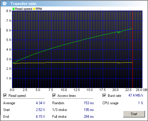 Максимальную скорость чтения 6х привод развивает при чтении однослойных BD носителей. Двухслойные BD диски привод читает с максимальной скоростью 4.2х Привод уверенно прочитал все тестовые носители формата BD.
