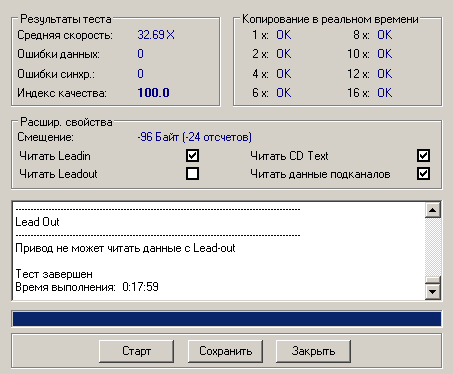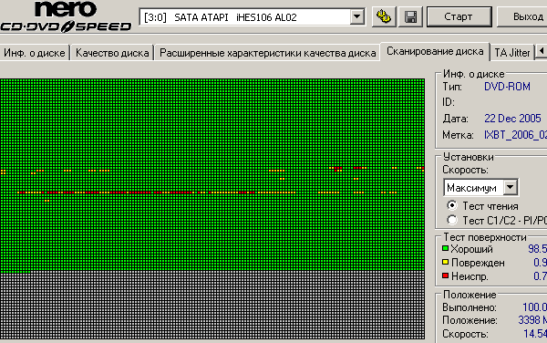Привод достаточно уверенно читает различные типы DVD носителей, но только в том случае если они хорошего качества или с незначительными царапинами. При наличии средней степени повреждений, начинаются проблемы, что можно увидеть на скриншоте.