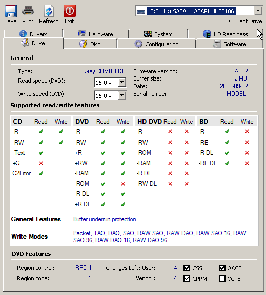Теперь попробуем получить немного информации о приводе с помощью различных утилит. Поддерживаемые форматы и типы дисков, можно узнать с помощью программ Nero Infotool.