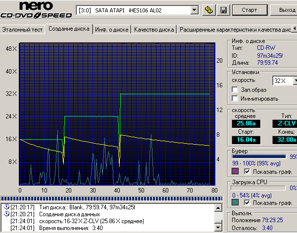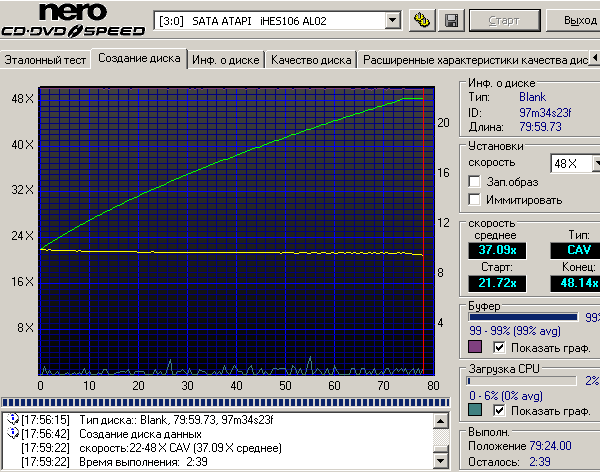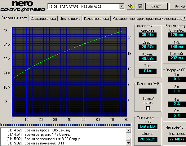 При записи различных CD-R носителей на максимальной скорости 48х привод использует режим CAV, а при записи CD-RW носителей используется режим Z-CLV. При тестировании дисков, записанных на этом приводе, к качеству записи не возникло никаких претензий, все записанные диски уверенно прочитались тестовыми приводами.