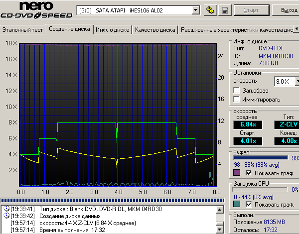 Теперь посмотрим, как привод справляется с записью дисков формата DVD+/-RW. Максимально доступная скорость записи, при использовании соответствующих болванок, составляет 8х для болванок DVD+RW и 6x для болванок DVD-RW. В обоих случаях, при записи, используется технология Z-CLV.