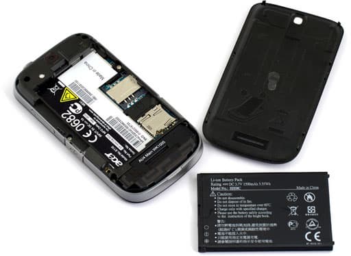 Литий-йонная аккумуляторная батарея, которой комплектуется Асеr Е110, имеет ёмкость 1500 мА·ч. Субъективно вес батареи лишь немногим меньше, чем у основного корпуса коммуникатора, но такая «расточительность» не приносит особого дискомфорта. Зато высокая ёмкость обеспечивает достойное время автономной работы. Несмотря на первоначальный скепсис относительно длительности работы Android-коммуникатора от батареи, мы получили тестовое подтверждение того, что Е110 превосходит в мобильности многих WinMobile-собратьев.