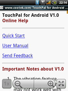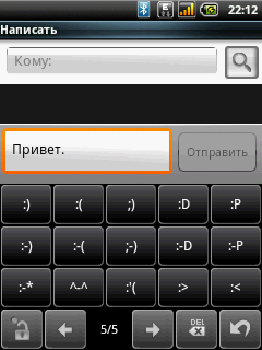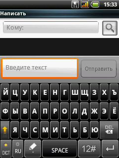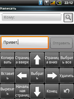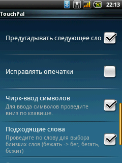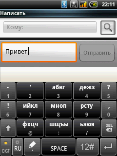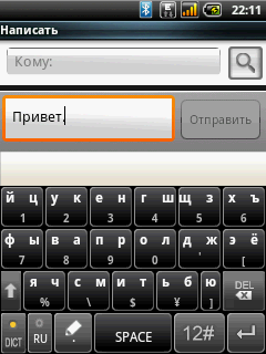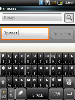 Размер клавиш штатной виртуальной клавиатуры все-таки недостаточно велик для уверенного набора текста. Особенно это заметно при наборе текста кириллицей. Свою лепту вносит и отсутствие возможности переключиться в альбомный режим, где кнопки становятся больше. Все же, ввод текста пером более удобен для резистивного экрана и небольшой диагонали матрицы. TouchPal, так называется встроенная в Е110 клавиатура, помимо обычной QWERTY предлагает телефонную и двухсимвольную (по два символа на клавишу) раскладки. Помогать при вводе призвана система подсказок, автоввода и «чирк-символов», когда спецсимволы и цифры вводятся быстрым движением пальца по кнопке. Все эти ухищрения несколько облегчают ввод символов.