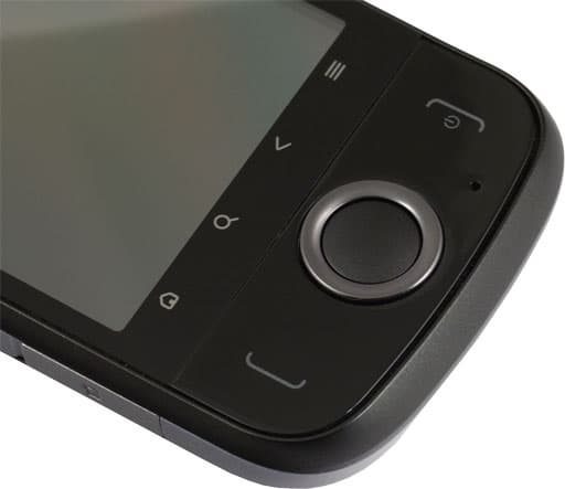 Расположение основных элементов управления на лицевой панели типично. Нашлось место даже уходящему в прошлое пятипозиционному джойстику (в Android-смартфоне — ненужному). Несмотря на обманчивую круглую форму, он не вращается, как, например, в HTC Artemis. Это обычный пятипозиционный джойстик с центральной кнопкой. По обе стороны от него находятся огромные, в соотношении с размерами аппарата, кнопки начала и окончания вызова. Последняя по совместительству играет роль клавиши управления питанием. Все кнопки имеют четкий ход. Джойстик выступает над поверхностью корпуса — ориентируясь на ощупь, промахнуться мимо нужной клавиши сложно. На юго-восток от джойстика расположен микрофон коммуникатора и соответствующее микроскопическое отверстие.